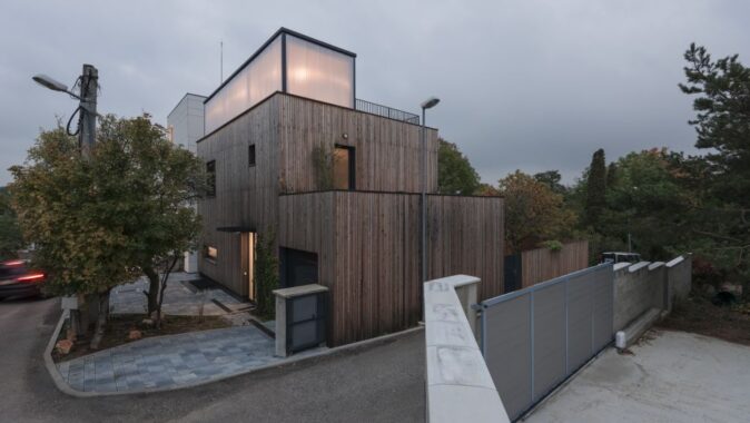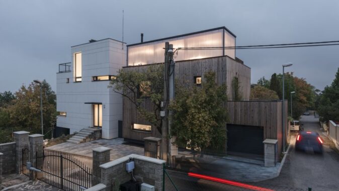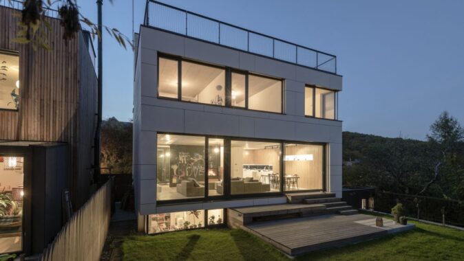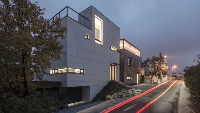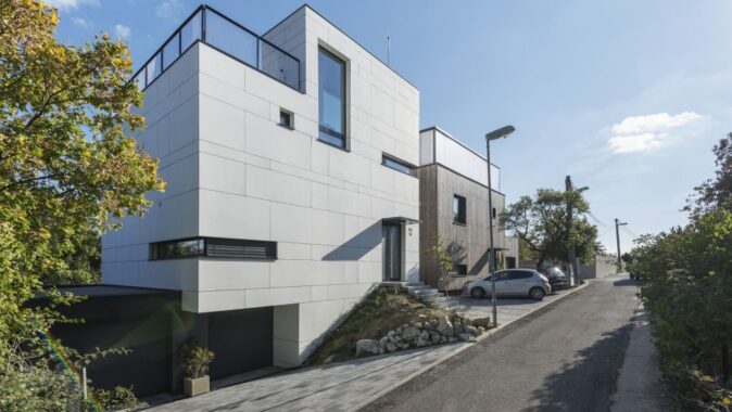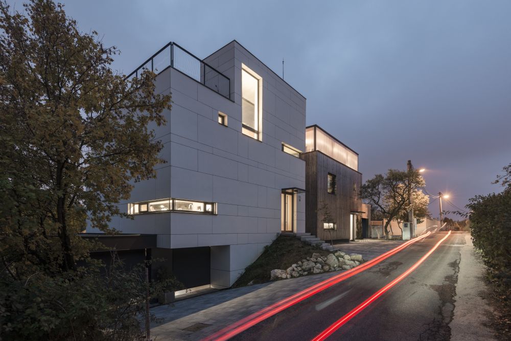 Pozemok sme rozdelili na dve rovnaké časti, každý dom má teda 330 metrový pozemok. Obidva domy majú podobný základný pôdorys a dispozičnú logiku, no predsa sú úplne iné. Majitelia mali celkom iný zoznam priorít, čo sa odrazilo na finálnej architektúre každého domu.