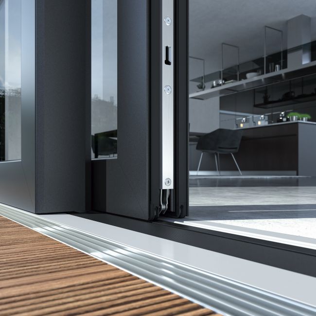 Kromě oken a dveří musejí i posuvné systémy splňovat určité požadavky, aby je mohli snadno používat všichni obyvatelé bez ohledu na to, zda mají problémy s pohyblivostí či nikoli. Zapuštěné prahy jsou proto i zde nezbytné. Hliníkové posuvné systémy se zdvihem Schüco ASE 60 (stavební hloubka 60 mm) a ASE 80.HI (vysoká izolační schopnost, stavební hloubka 80 mm) a dále i plastový posuvný systém se zdvihem Schüco LivIngSlide PVC-U tyto požadavky splňují. Zejména bezbariérový zapuštěný práh pak poskytuje pohodlný rovný přechod mezi vnitřním a vnějším prostorem. S bezbariérovým prahem u hliníkových a plastových posuvných systémů se zdvihem lze snadno kombinovat další standardní požadavky, jako je účinná tepelná izolace a odolnost proti vloupání na úrovni RC 2.