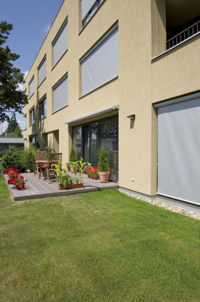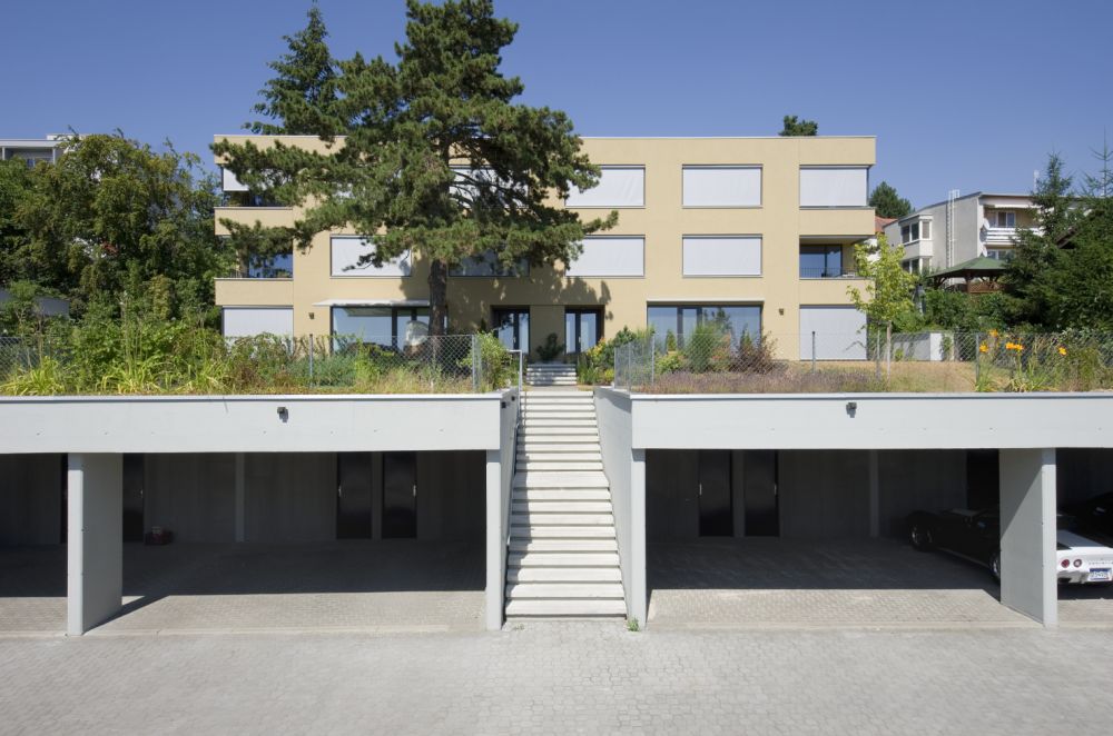 Stavební pozemek je prudce svažitý. Níže položená část, bližší přístupové komunikaci je využita pro parkování, zčásti venkovní a zčásti pod přístřešky obsahujícími zároveň skladovací kóje. Střecha parkovacích přístřešků byla řešena jako zelená, aby před domem vznikla co největší zahrada. Dům je umístěn ve výše položené části pozemku za vzrostlou borovicí, která představovala jedinou stávající hodnotnou zeleň.