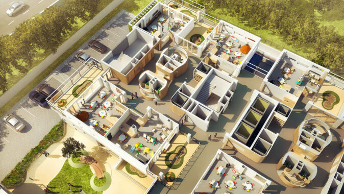 „Stáli jsme před úkolem převést nápady pana Malaguzziho do trojrozměrné podoby ve velkém měřítku,“ pokračuje Viktorie. „Jako každá škola musí i Early Learning Village efektivně, ale přitom nenásilně, splňovat logistické požadavky pro zajišťování pokrmů, zásobování, pro šatny, prostory učitelů, dodávky, skladování a tak dále. Ale ještě důležitější je její designové řešení tak, aby stimulovala prvotní zkušenosti dětí s tvary, velikostmi, interakcemi, barvami a slunečním světlem,“ shrnula.