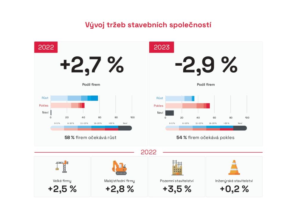 Do konce roku 2022 je očekáván růst jak v inženýrském, tak v pozemním stavitelství. V roce následujícím jejich očekávání již optimistická nejsou. Zatímco společnosti zaměřené na pozemní stavitelství očekávají pokles trhu o 3,4 %, společnosti zabývající se inženýrským stavitelstvím predikují ještě větší propad – o 4,7 %. Důvodem nejistot je mimo již zmíněné vlivy i rozpočtová politika státu.