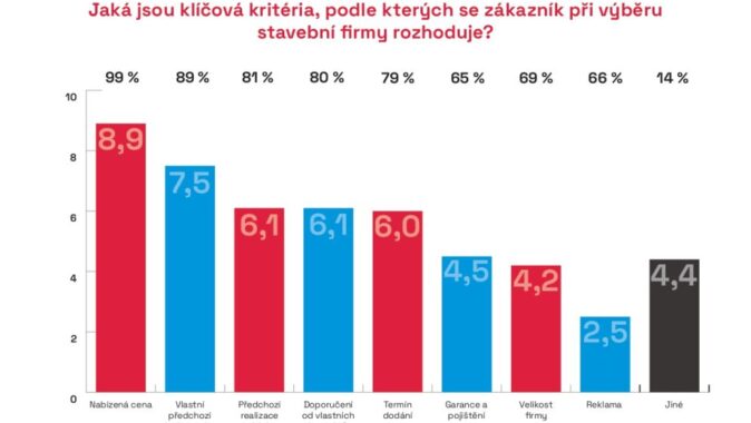 Nabízená cena, předchozí zkušenosti a doporučení od známého jsou hlavní faktory, na jejichž základě se zákazník rozhoduje při výběru stavební společnosti. Reklama, pojištění nebo velikost firmy v jejich výběru naopak nehrají významnou roli.