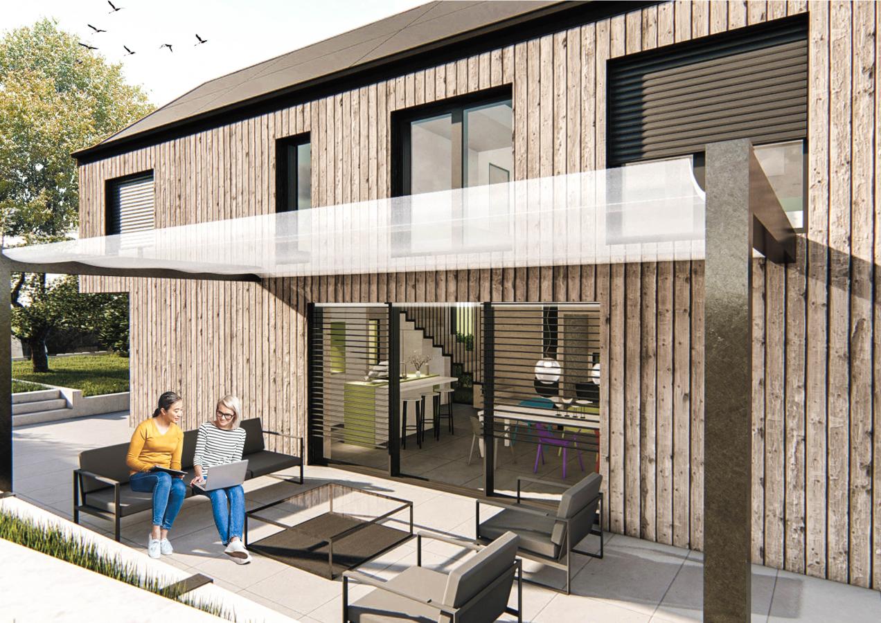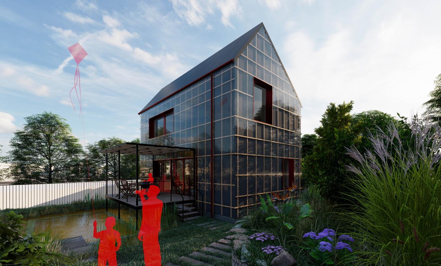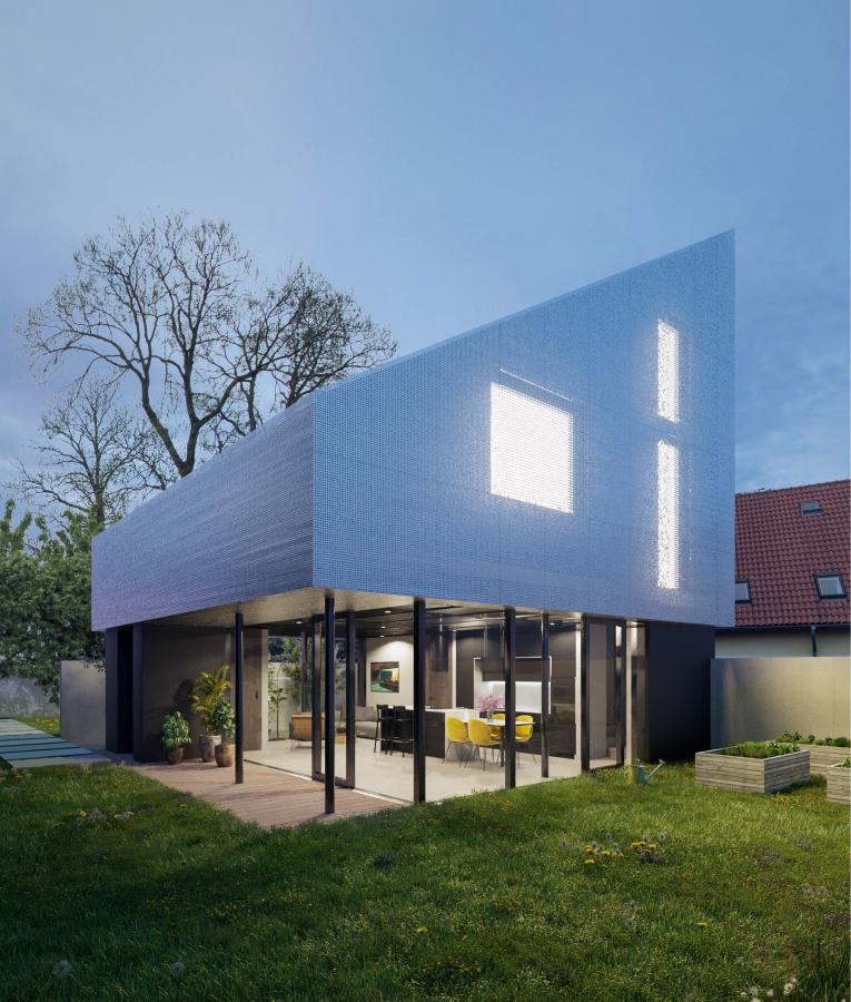 navrhovaná dřevostavba s originálním využitím sklolaminátových fasádních
