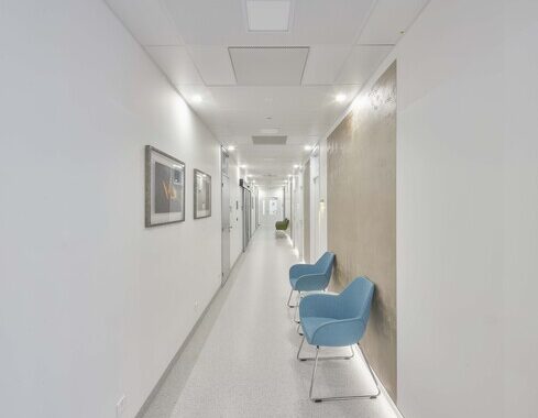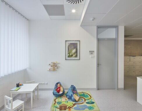 Aby z původních prostor vzniklo příjemné prostředí pro pacienty i lékaře, musely projít kompletní přestavbou. Při projektování byla pozornost směřována k naplnění všech požadavků hlavně z pohledu správné funkčnosti kliniky. Nezapomnělo se však i na výslednou vizuální podobu. Na chodbách, v kancelářích, pokojích pro pacienty a vyšetřovnách se uplatnily akustické sádrokartonové perforované kazety Gyptone Quattro 70 Activ’Air s polozapuštěnou hranou v kombinaci s hladkými kazetami Gyptone Base 31 Activ’Air. Kazety jsou skládány v pravidelných tvarech, ty perforované jsou po okrajích místnosti lemovány hladkými kazetami. Architekt tak docílil jemných zakončení a přechodů i v případě řezání kazety na požadované rozměry. Nikde tak nedochází ke zbytečnému přerušení perforace desek.