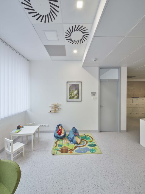 Aby z původních prostor vzniklo příjemné prostředí pro pacienty i lékaře, musely projít kompletní přestavbou. Při projektování byla pozornost směřována k naplnění všech požadavků hlavně z pohledu správné funkčnosti kliniky. Nezapomnělo se však i na výslednou vizuální podobu. Na chodbách, v kancelářích, pokojích pro pacienty a vyšetřovnách se uplatnily akustické sádrokartonové perforované kazety Gyptone Quattro 70 Activ’Air s polozapuštěnou hranou v kombinaci s hladkými kazetami Gyptone Base 31 Activ’Air. Kazety jsou skládány v pravidelných tvarech, ty perforované jsou po okrajích místnosti lemovány hladkými kazetami. Architekt tak docílil jemných zakončení a přechodů i v případě řezání kazety na požadované rozměry. Nikde tak nedochází ke zbytečnému přerušení perforace desek.