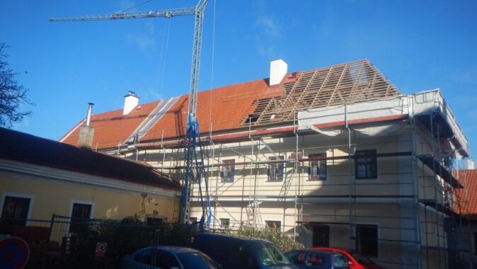 Dominantní sedlová střecha s valbou byla již dlouho v havarijním stavu, keramické tašky se naposledy měnily někdy v sedmdesátých letech. V nejlepší kondici nebyl ani barokní krov: prostorná střecha se svého času využívala i jako sýpka na obilí a dřevěné konstrukce trpěly nadměrnou vlhkostí. Všechny poškozené prvky krovu tak bylo zapotřebí nejprve opravit složitým a zdlouhavým protézováním.