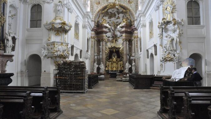 Původní vybavení kostela bylo částečně provizorní (dřevěné stupně oltáře, druhotně vložená mřížka presbytáře apod.), částečně uloženo v depozitáři. Restaurováním prošla sochařská i malířská výzdoba a také kamenná dlažba v lodi kostela a přilehlých bočních kaplích. S vlastní úpravou liturgického prostoru se čekalo až na závěr stavebních úprav na výsledek soutěže na dispoziční a výtvarné řešení.