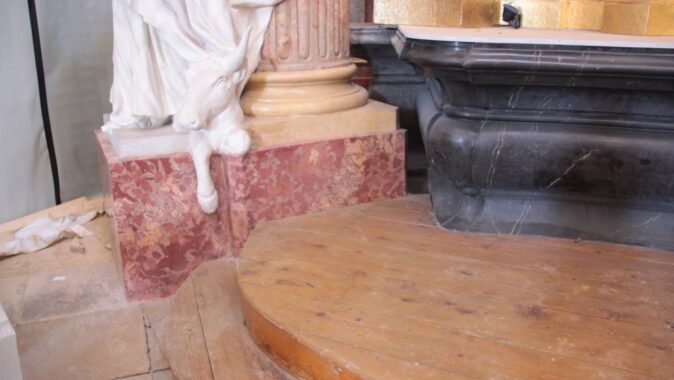 Nejvyšší stupeň v závěru oltářního prostoru nahradil stávající dřevěné stupně a zachoval přístup ke stávající menze retabulového oltáře.
