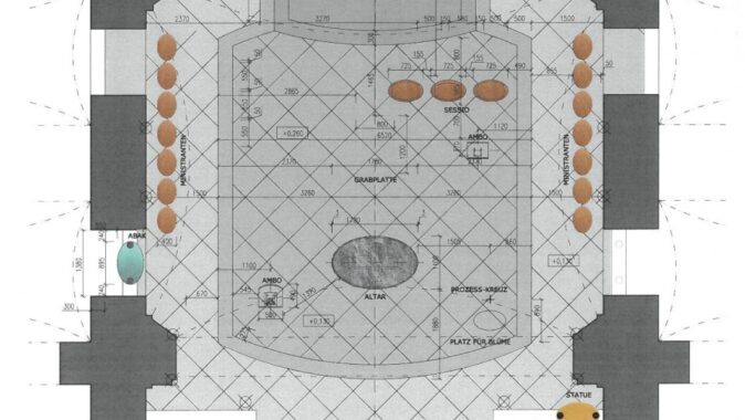 Do půdorysu kostela mělo být zahrnuto u umístění historicky cenné křtitelnice a příležitostného pódia pro zpěváky a orchestr.