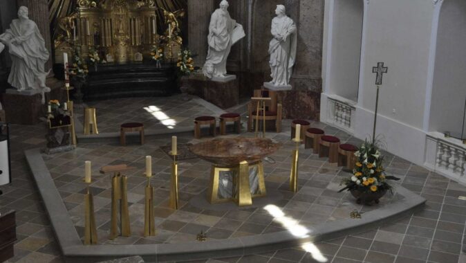 Pod navrhovanou kamennou oválnou menzou z červeného mramoru barvou a strukturou korespondující se stávajícími mramory architektury barokního retabulového oltáře nesenou zlacenou subtilní konstrukcí lemující vitraje se v dlažbě kostela promítá její obrys s deskou relikviáře uloženou před menzou. Nosná konstrukce menzy je opsána i v dalším vybavení presbytáře, u podnože ambonu, stojanu pro velikonoční svíci i svícnů stojících v presbytáři.