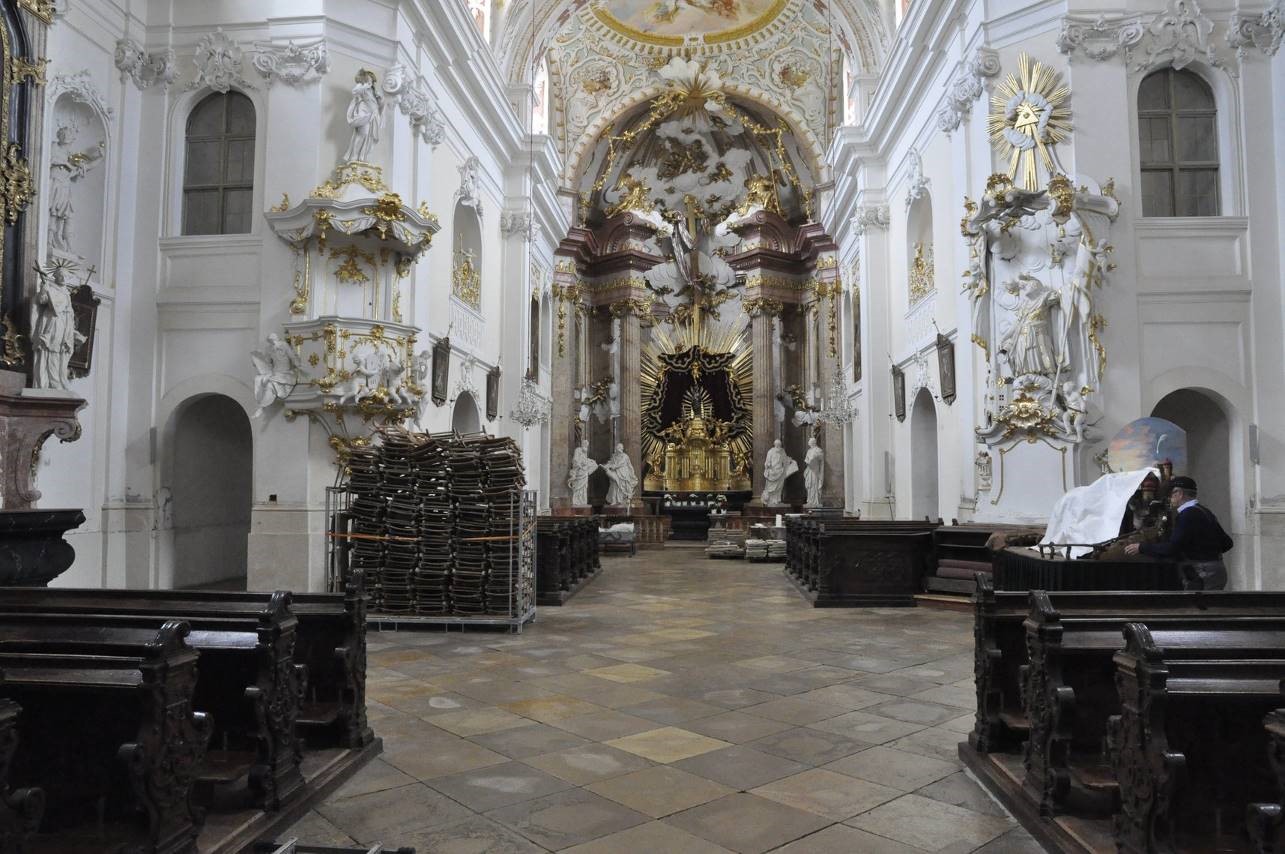 Původní vybavení kostela bylo částečně provizorní (dřevěné stupně oltáře, druhotně vložená mřížka presbytáře apod.), částečně uloženo v depozitáři. Restaurováním prošla sochařská i malířská výzdoba a také kamenná dlažba v lodi kostela a přilehlých bočních kaplích. S vlastní úpravou liturgického prostoru se čekalo až na závěr stavebních úprav na výsledek soutěže na dispoziční a výtvarné řešení.