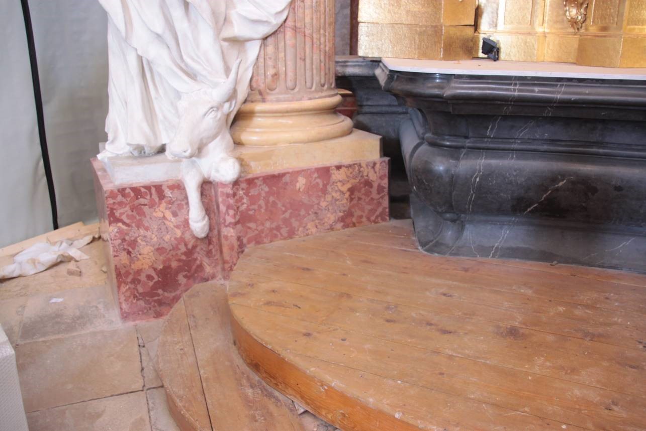 Nejvyšší stupeň v závěru oltářního prostoru nahradil stávající dřevěné stupně a zachoval přístup ke stávající menze retabulového oltáře.