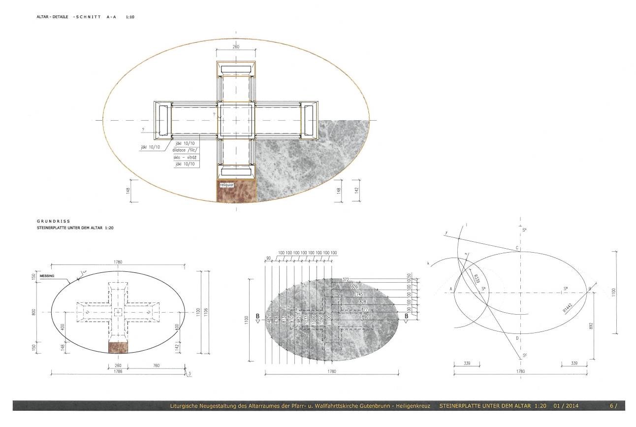 Pro Gutenbrunn – Heiligenkreuz bude pro menzu použit přírodní kámen, v souladu s požadavky liturgických předpisů.[1] Mramor, který svou monumentalitou, strukturou a barevností bude pro umělecky náročný interiér odpovídajícím materiálem, bude vážit kolem 1000 kg. Tomu musí odpovídat dimenzování nosné konstrukce, která však má opticky působit lehce. Nový oltář se má stát symbolickým centrem světla a jeho leštěná mensa současně zrcadlí mimořádně kvalitní freskovou výzdobu kostelní klenby.