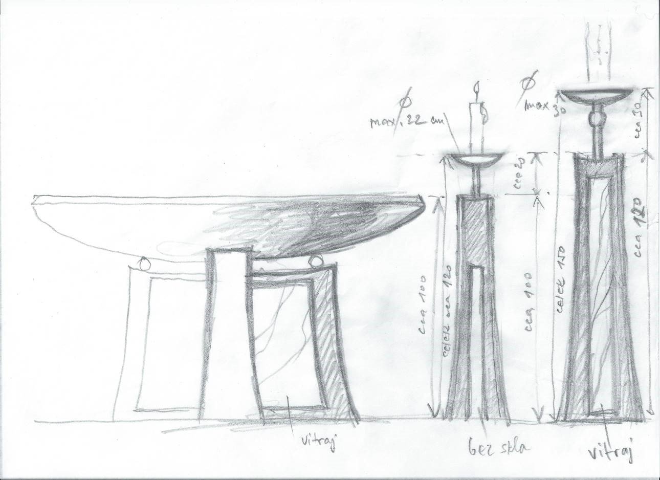 Svícny byly provedeny v minimálním počtu 2ks, podstavec do výše oltářní mensy, stopka s miskou a svíčkou nad tuto rovinu. Držáky s miskami a svícemi nebyly provedeny jako samostatně přenosné, celé svícny při výjimečných příležitostech ale přenosné budou.