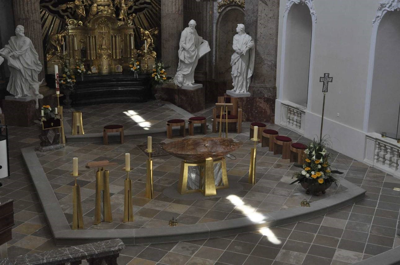 Realizace mensy a nosných částí oltáře proběhla za spolupráce firem v Rakousku (přímá koordinace kameník – zámečník), podkladem byl technický výrobní výkres oltáře pro Gutenbrunn-Heiligenkreuz, který byl konzultován stavebním odborem diecéze a dostalo se mu vysokého ohodnocení ze strany arch. Pfosera i řemeslníků. Ovál pod oltářem v dlažbě je navržen z jednoho kusu kamene (dodavatel Ehrlich) a obkroužen vloženým mosazným páskem. Mosazný pásek bude lemovat i kamenný kryt relikviáře. Na mense budou vyznačeny (vybroušeny) čtyři rovnoramenné kříže při okrajích mensy (realizace Ehrlich), grafický návrh na půdorysu mensy byl dodán, vybrána kombinace rovnoramenného kříže a 4 umístění při obvodu mensy. Pod oltářem byl proveden základ ze železobetonu. Současně s dlažbou oltářního stupně presbytáře došlo k umístění relikviáře u přední nohy oltáře, materiál: salzburský hnědočervený mramor.