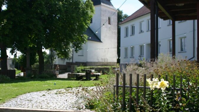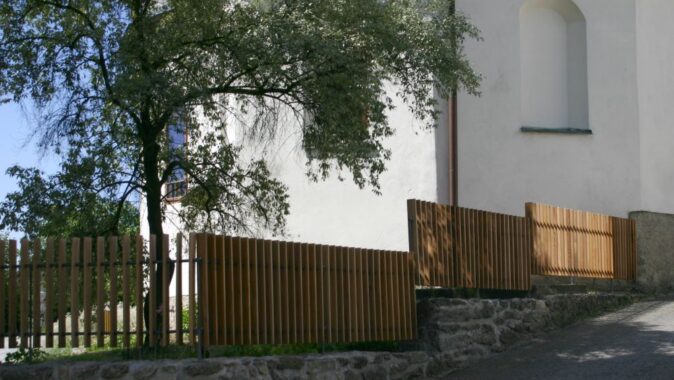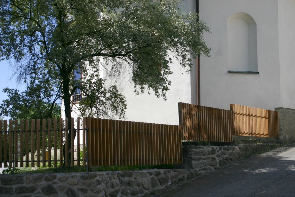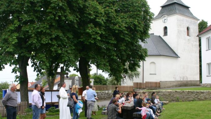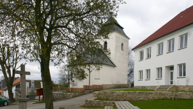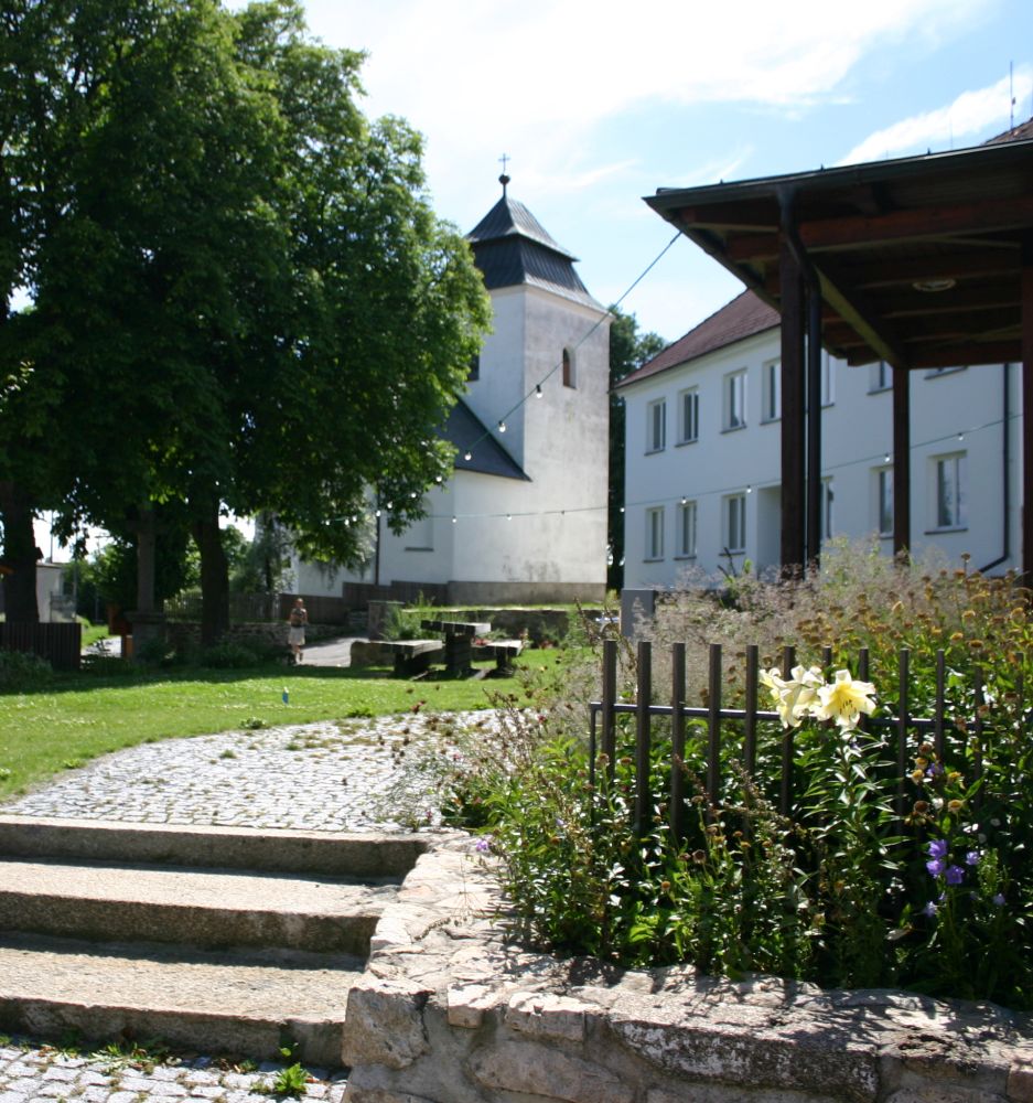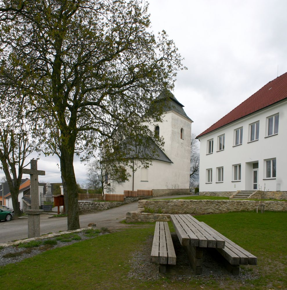 Autobusovou čekárnu jsme nahradili dlouhou lavicí podél zdi, která díky své poloze umožňuje pozorovat život na „dolní“ návsi a ze které se otevírá výhled do krajiny. Lavice slouží nejen cestujícím, ale i kolemjdoucím, cyklistům či výletníkům. Pro pozorování života „horní“ návsi je u štítové zdi fary umístěna lavička v záplavě květů.