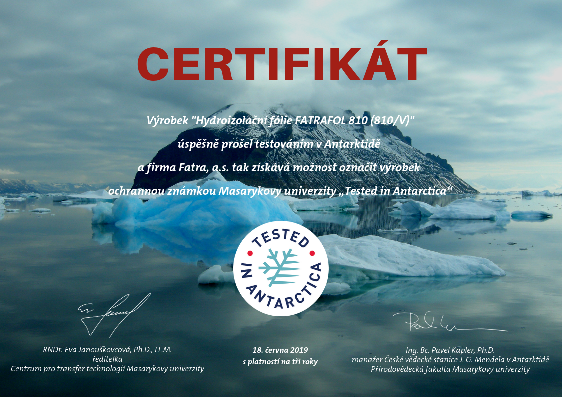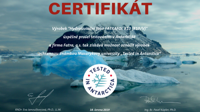 certifikátem „Testováno v Antarktidě“, společnost Fatra, a.s. je jednou