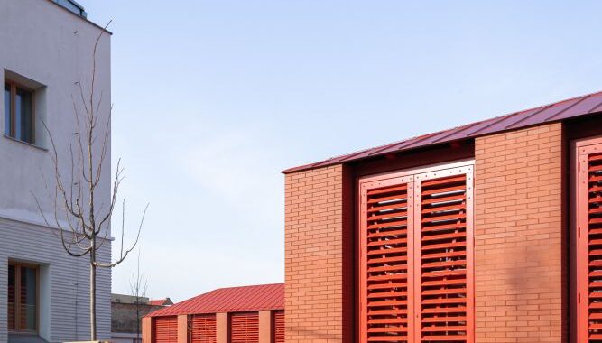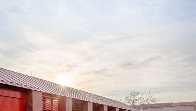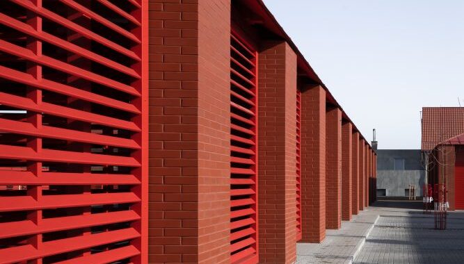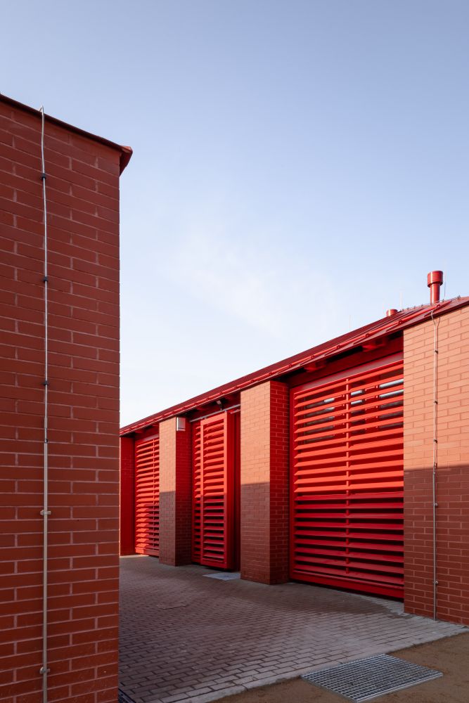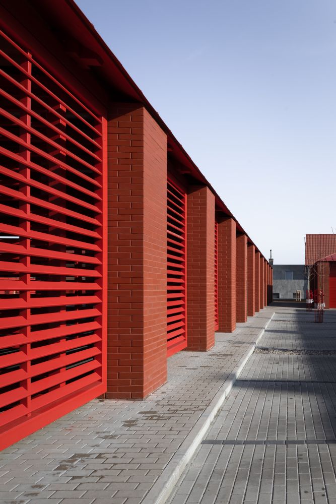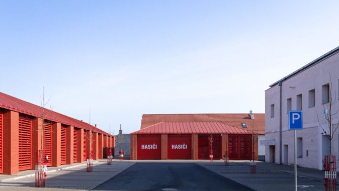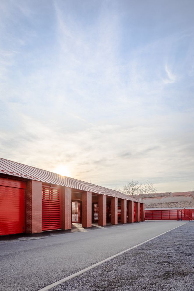 Barevné objekty hasičské zbrojnice a technických služeb vytvářejí s Domem služeb trojici veřejných staveb, které spolu „komunikují“ a dávají novému nádvoří lidské měřítko. Hasičská zbrojnice se otáčí svým čelem do Mělnické ulice a široké schodiště vedle ní umožňuje důstojný nástup do nového veřejného prostoru. Ten je oživen dvěma řadami stromů mezi kolmými stáními a sochami „ochránců stromů“ Ivany Šrámkové. Ti už dostali od občanů svá jména a dávají nádvoří charakter a určitou radost.