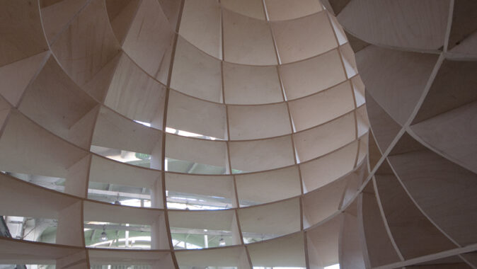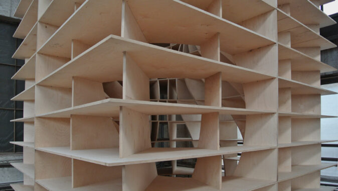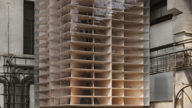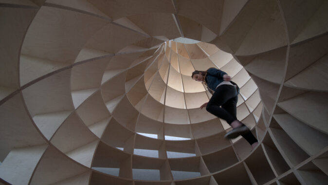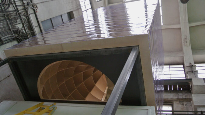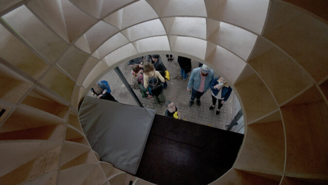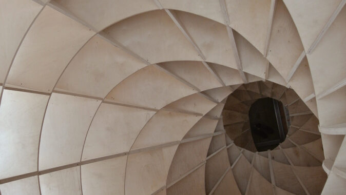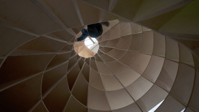 Prázdná, gigantická barokní šroubovice sevřená a vytvarovaná vertikálními a horizontálními rovinami – zvenku vypadajícími jako malý dům / věž.