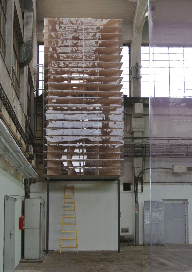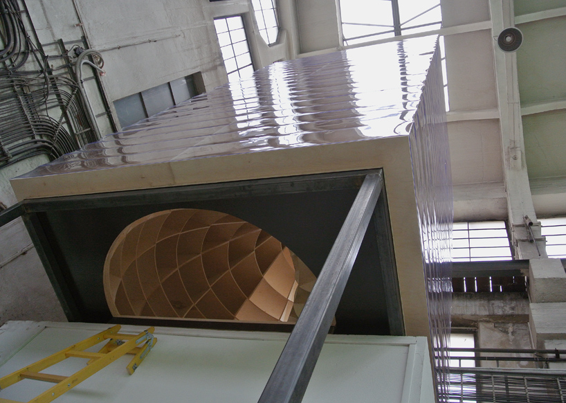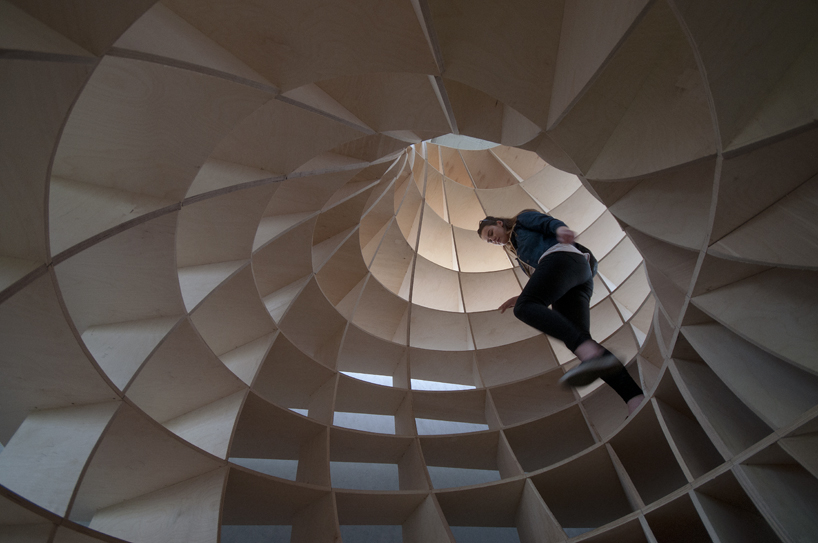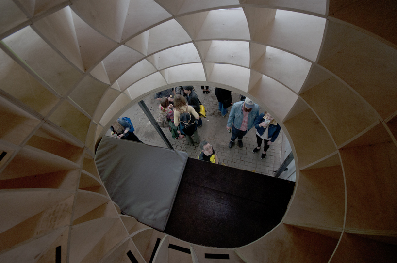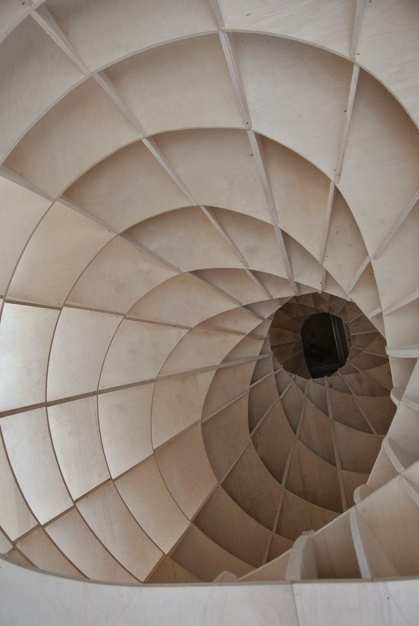 Prázdná, gigantická barokní šroubovice sevřená a vytvarovaná vertikálními a horizontálními rovinami – zvenku vypadajícími jako malý dům / věž.