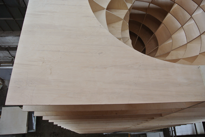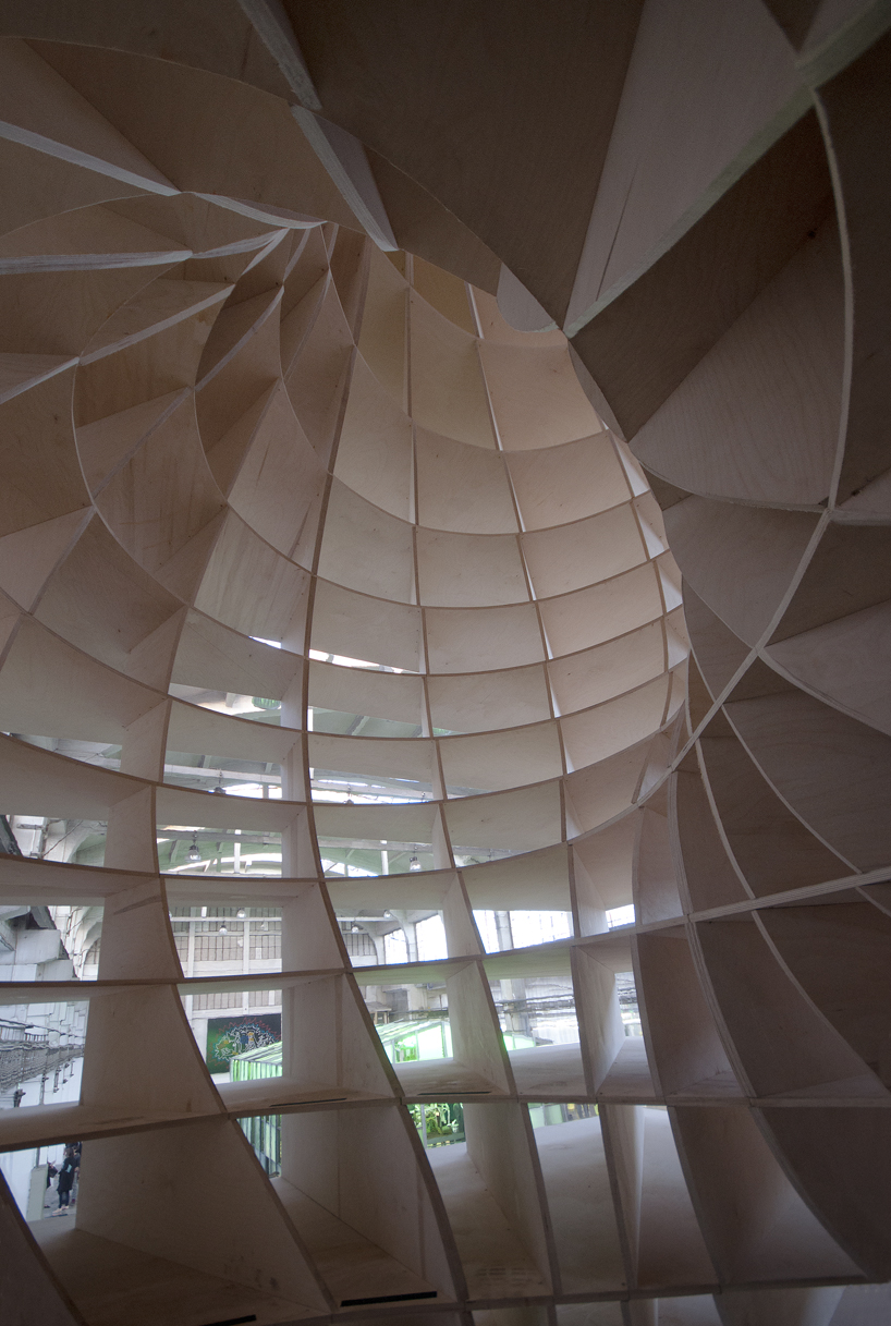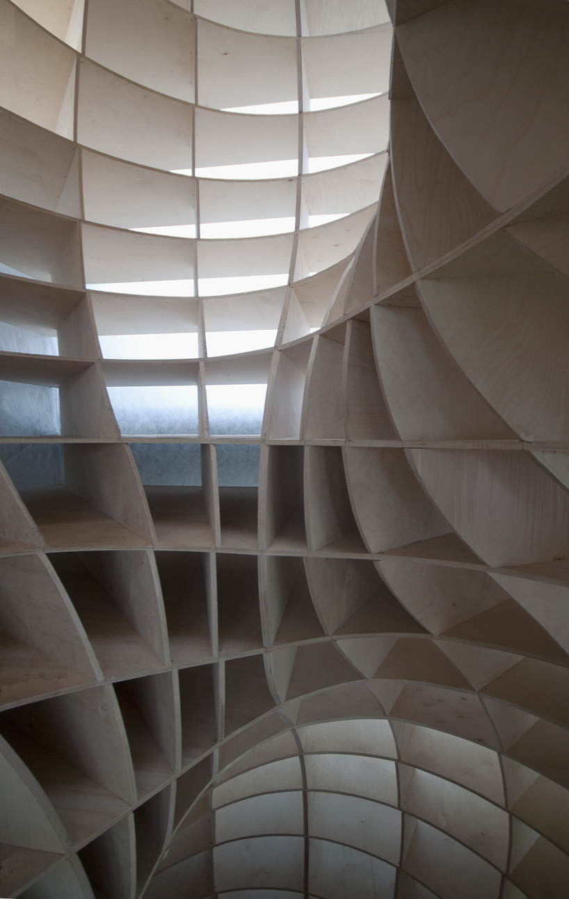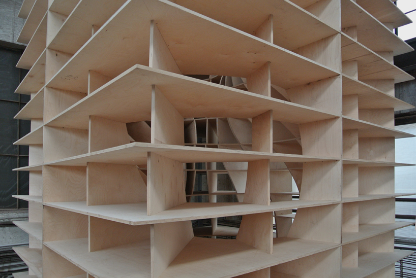 Prázdná, gigantická barokní šroubovice sevřená a vytvarovaná vertikálními a horizontálními rovinami – zvenku vypadajícími jako malý dům / věž.