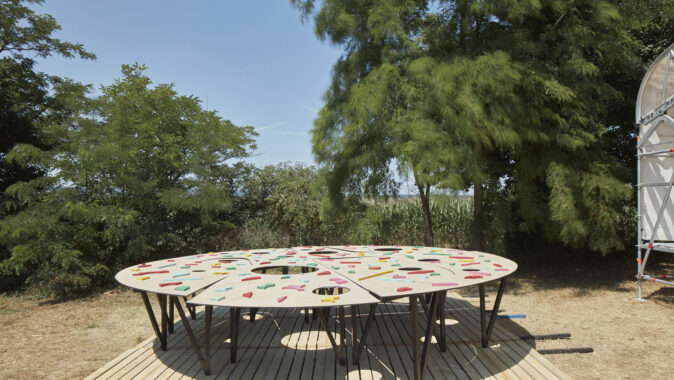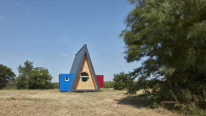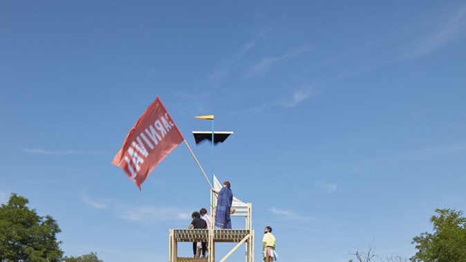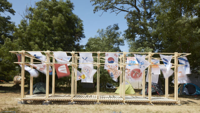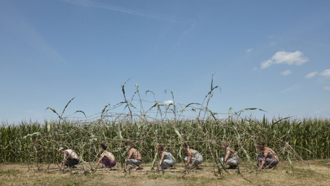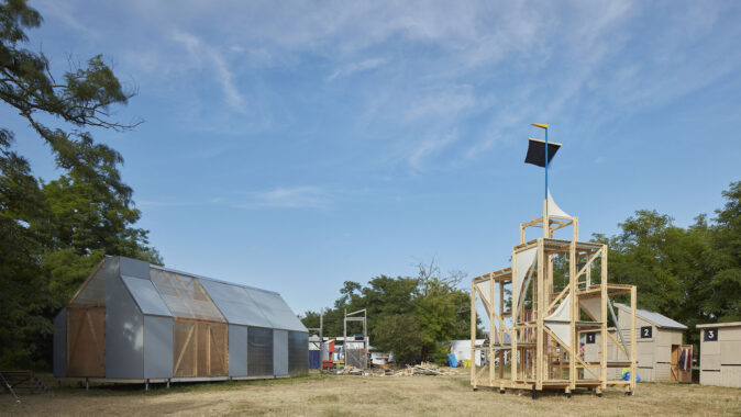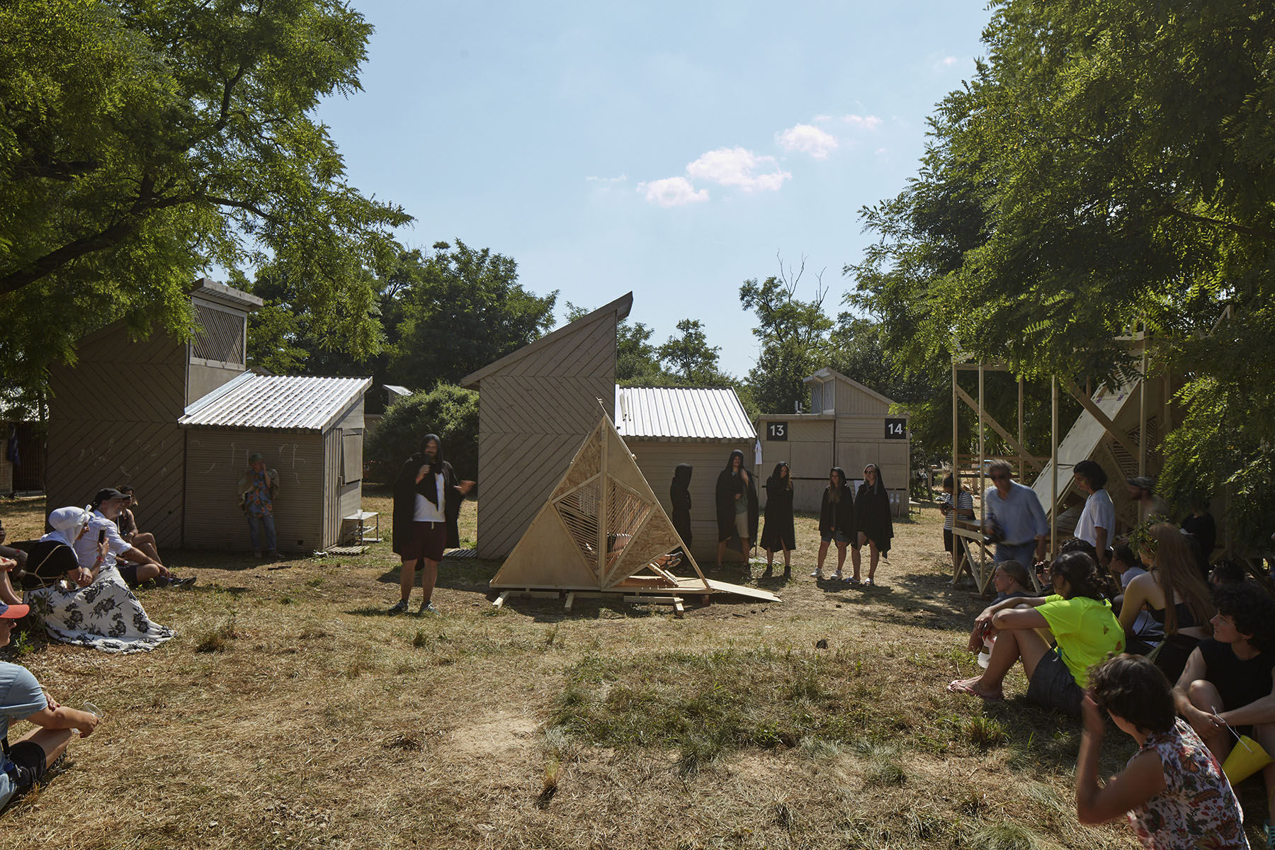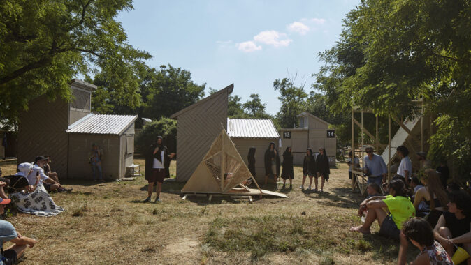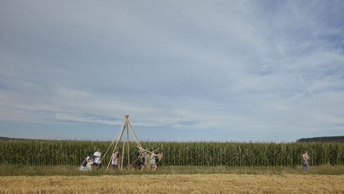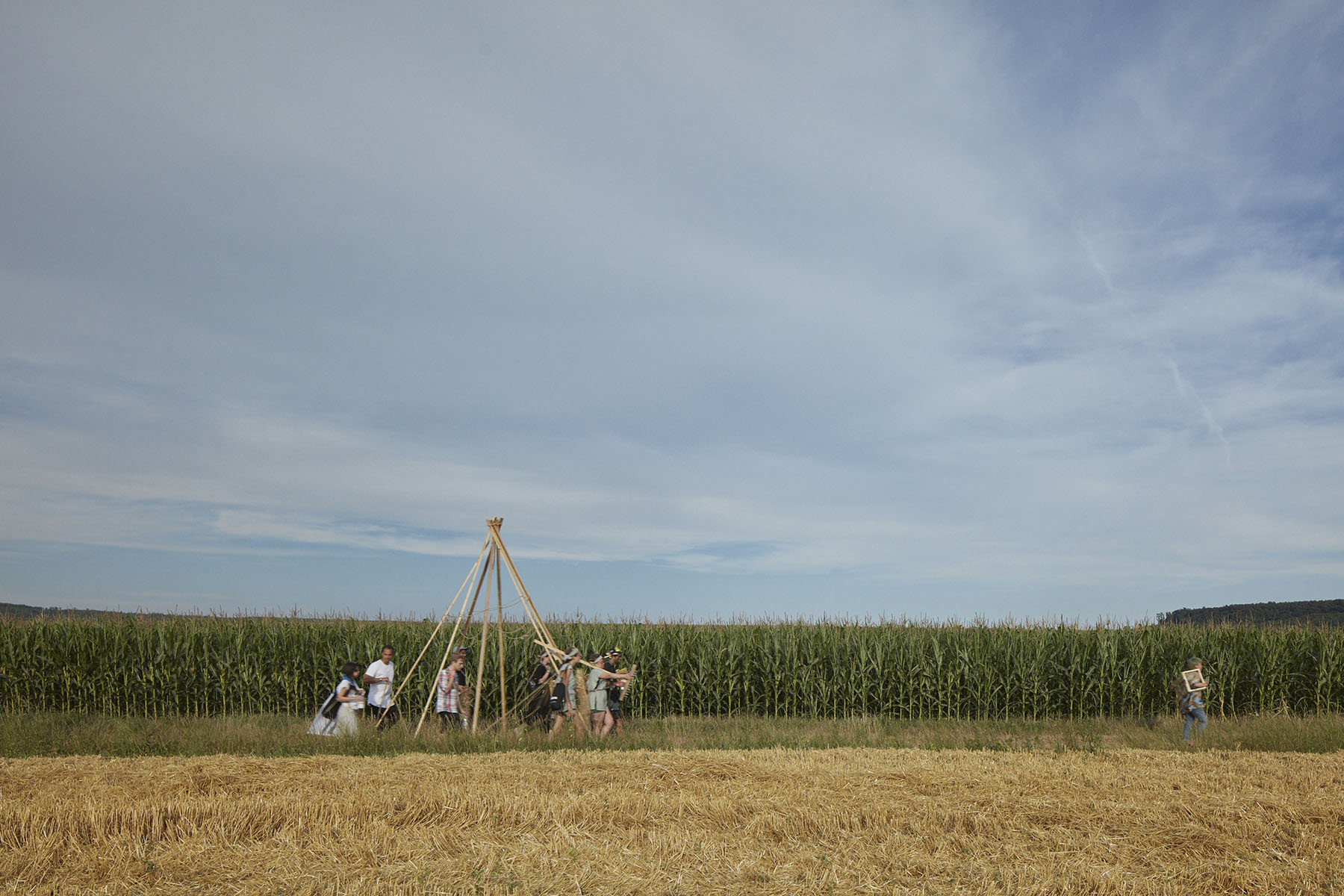 U prašné cesty stojí dřevěná slavobrána, kterou zdobí černá trika příchozích architektů. Je to symbolický moment odevzdání. Začíná proces přijímání nových zkušeností skrze práci se dřevem a tvoření v komunitě dalších stavitelů.
