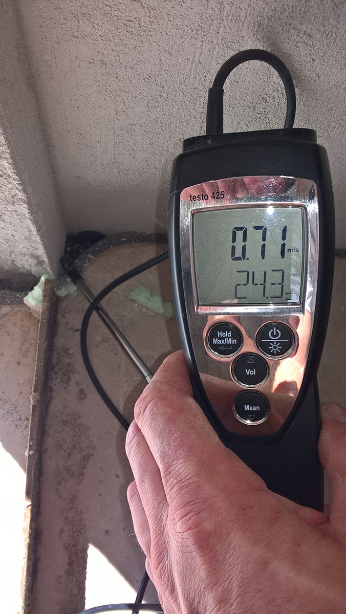 Ukázky z měření metodou „B“ v době, kdy dům ještě neměl vnější omítky a byla realizována pouze hrubá podlaha. Ostatní instalace a průchody byly realizovány a utěsněny. Pomocí mikronanometru detekujeme postupně všechna místa nežádoucího proudění vzduchu, jak je vidět na obrázcích v galerii.
