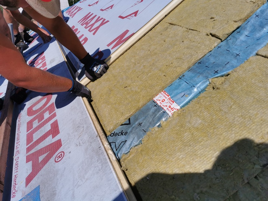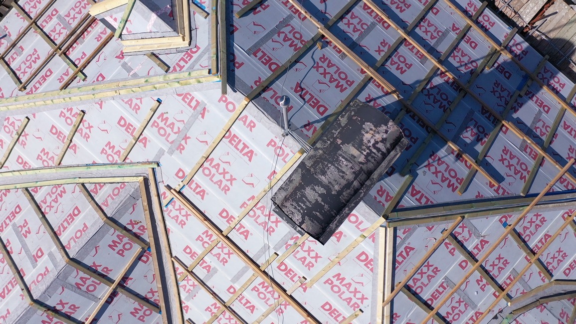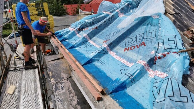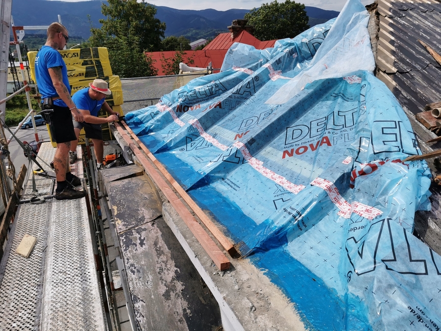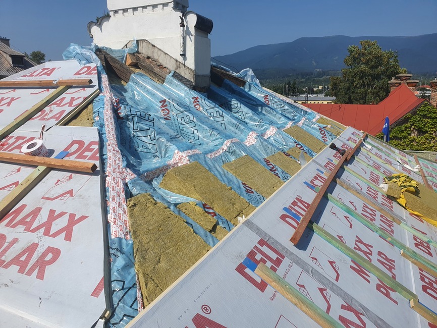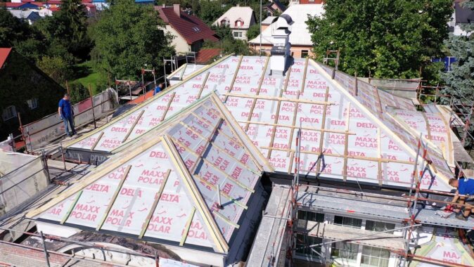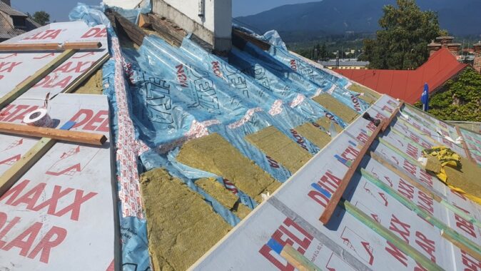 Z dôvodu nízkej hrúbky pôvodnej izolácie a zvýšenia komfortu bývania v podkroví v lete a v zime bolo nutné strechu dotepliť nadkrokvovou izoláciou – PIR doskami DELTA® MAXX POLAR z dôvodu (hrúbka…..) a zvýšenia komfortu užívania v zime a v lete.
