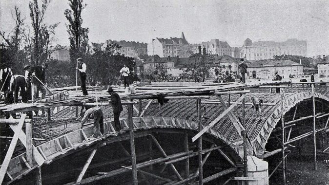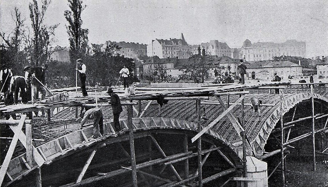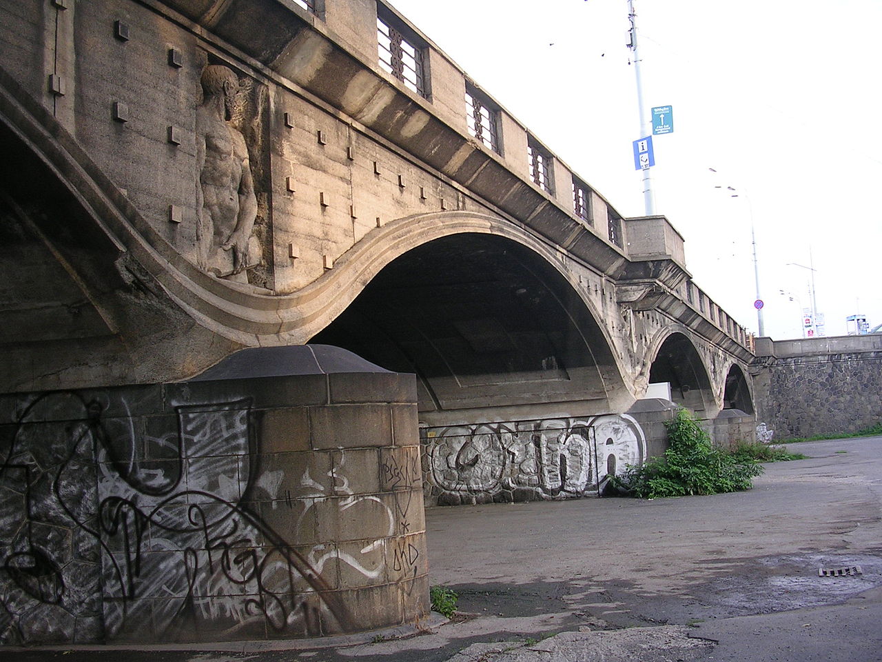 Část mezi Těšnovem a Štvanicí budovaná jako první byla původně tvořena ocelovou obloukovou konstrukcí. Mezi Štvanicí a Holešovicemi vznikl tehdy první betonový obloukový most v Praze. V letech 1958–1963 proběhlo jeho citlivé rozšíření podle návrhu Stanislava Hubičky, přičemž jižní část byla zcela nahrazena. Část nad řekou obsahuje mezi oblouky vylehčovací klenby se zdvojenými sloupy, které vytvářejí charakteristickou architekturu mostu. Dvojici sousoší Práce a Humanita na Holešovickém ústí vytvořil Jan Štursa. Reliéfy mužských a ženských torz nad pilíři jsou dílem L. Kofránka a B. Kafky. Medailonky tvůrců mostu vytvořili J. Mařatka a O. Guttfreund. Severní předmostí pochází z roku 1983, opět podle návrhu S. Hubičky.