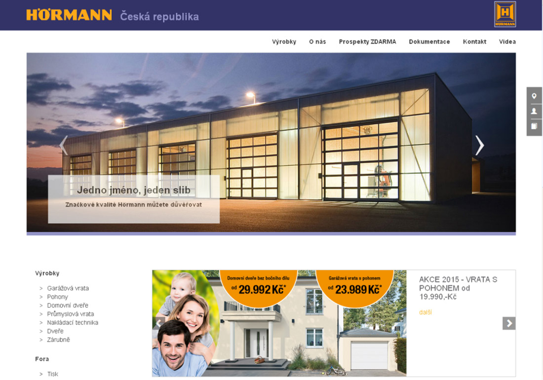 Horní lišta webu www.hormann.cz v sobě zahrnuje několik sekcí od dokumentací a prospektů až po jednotlivé výrobky. Pozornosti však neunikne zejména odkaz „Videa“, který v sobě ukrývá několik krátkých názorných „filmů“. Jde například o vtipné video k pohonu garážových vrat SupraMatic, ve kterém je naznačen souboj běžného pohonu a tohoto produktu společnosti Hörmann. Ve videu je názorně ukázáno, že pohon SupraMatic je o polovinu rychlejší, je díky vypínací automatice velmi bezpečný, je nehlučný a úsporný (v pohotovostním režimu méně než 1 W).