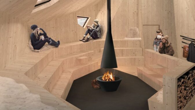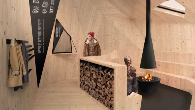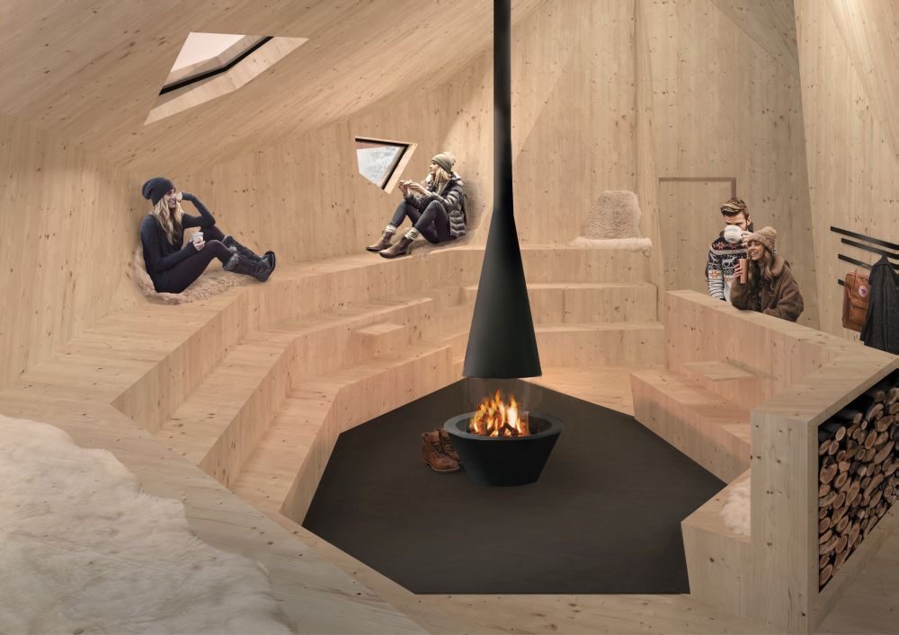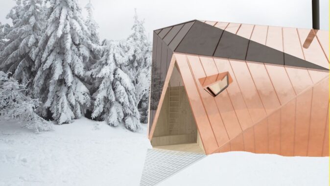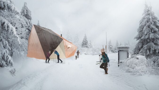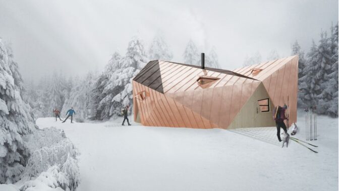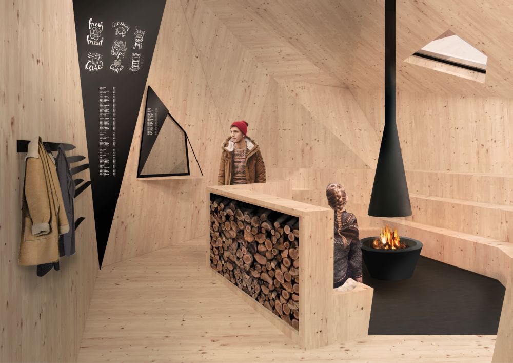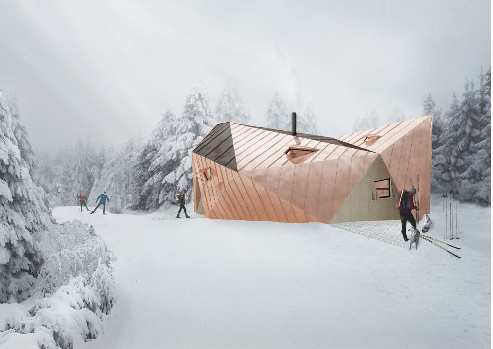 Důležité pro mě bylo vytvořit hlavní orientační bod se zázemím s odpovídající kapacitou a službami, který se stane součástí krajiny a bude pomocí architektonického výrazu a hmotových proporcí odrážet její charakter. Bufet se nachází deset metrů pod vrcholem Velké Deštné. V současné době je na tomto místě chata horské služby tradičního tvaru, kterou by měla v blízké budoucnosti nahradit novostavba. Tvar trojúhelníkových štítů, které jsou součástí dnešní podoby chaty, zachovávám a doplňuji je o anorganický plášť, tvořený rovněž z ploch trojúhelníků. Hmota stavby tedy působí jako kámen, jenž je součástí přírody. Vnitřní nosné stěny jsou také koncipovány jako trojúhelné plochy. S vnějším pláštěm tvoří celek a zapadají do jeho hran. Jedná se o konstrukční systém z rovinných, převážně tlačených desek, lomenic, které staticky spolupůsobí. U návrhu pro mne byla zásadní volba přírodních materiálů – masivní CLT panely umožňují zabezpečení tuhosti stavby takovéhoto tvaru, subtilnost a rychlou realizaci konstrukce, rovněž jsou finálním řešením povrchu v interiéru.