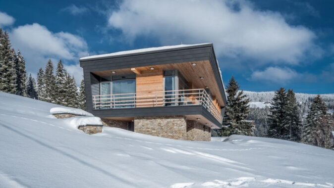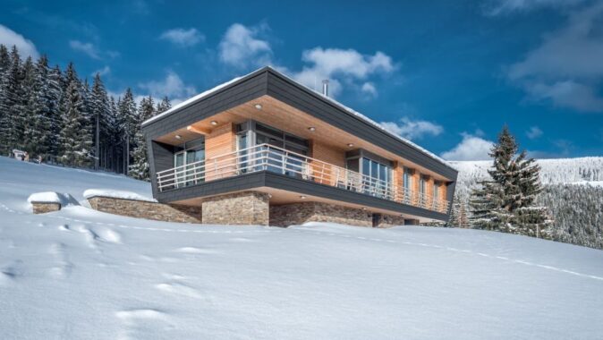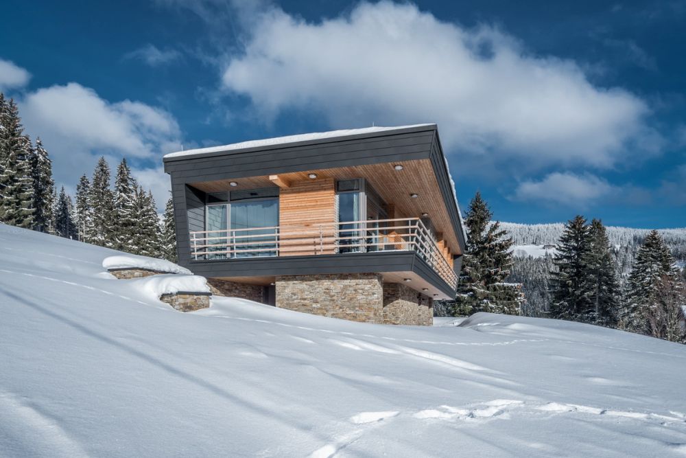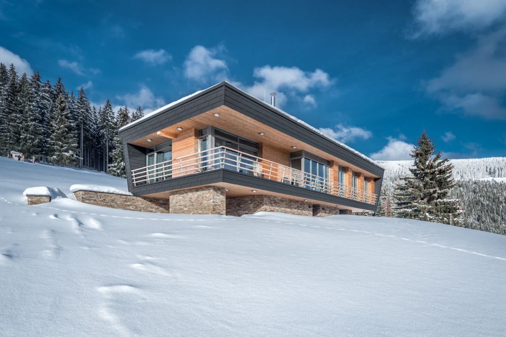 Fasády jsou z materiálů, které dobře odolávají povětrnostním vlivům. Podzemní podlaží je obloženo kamenem, nadzemní podlaží plechovým šindelem šedé barvy, který v lodžii doplňuje dřevěný obklad z modřínu.