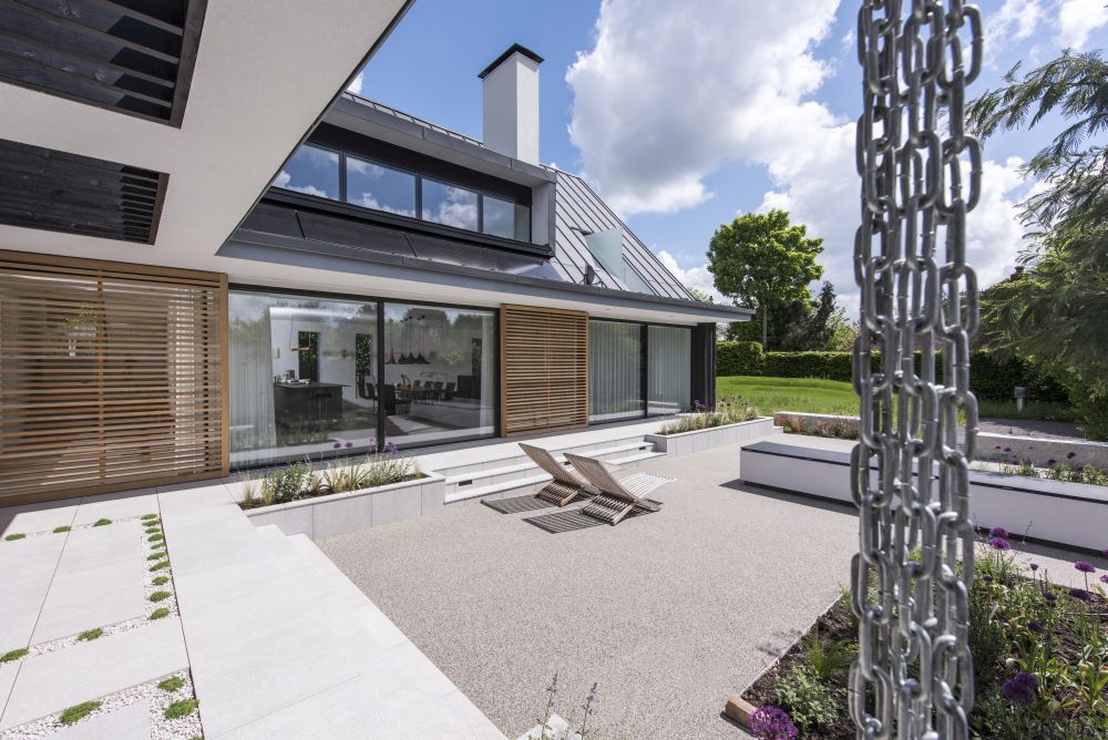 Důmyslná orientace stavby na pozemku, její tvar, zahrada evokující louku či