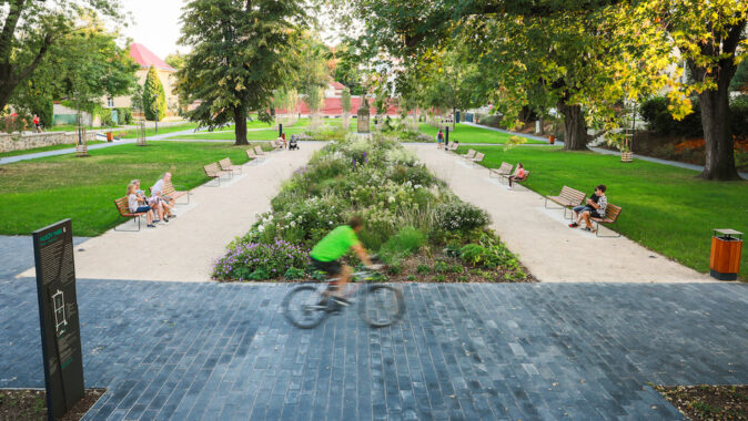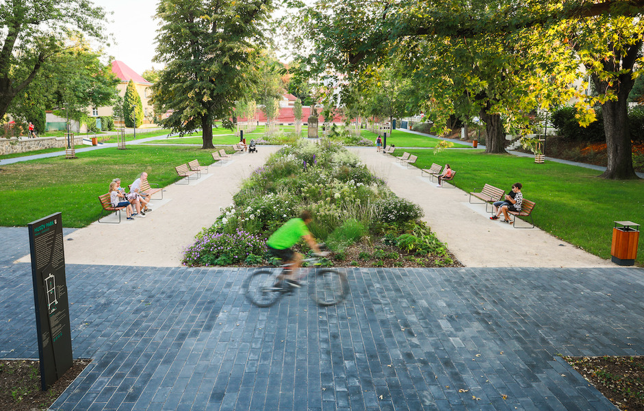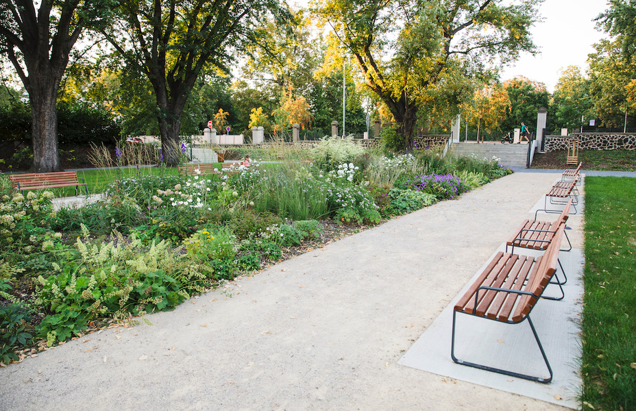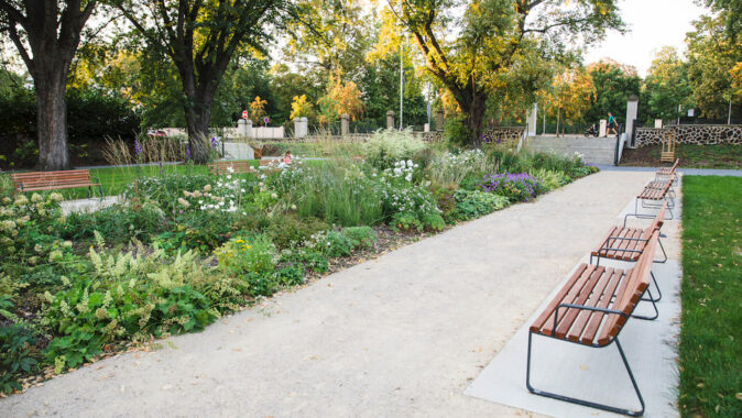 park. Na první pohled zaujmou netradiční záhony, autorský vodní prvek