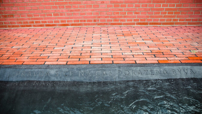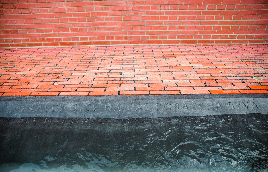 emise a sad okrasných jabloní odkazující k památce Mistra Jana Husa.