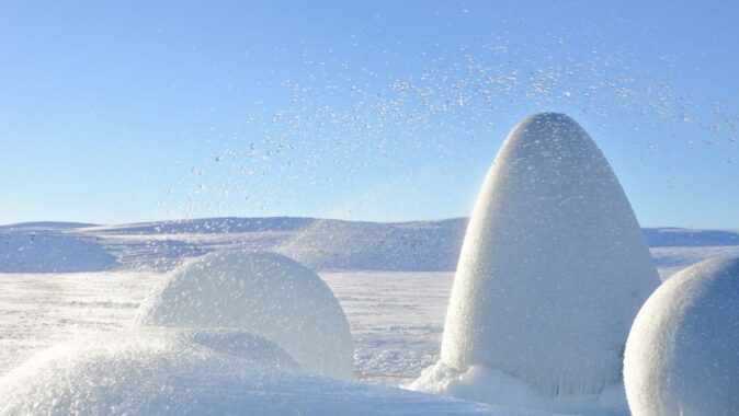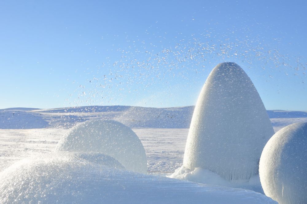 ledových objektů pomocí sprayování vody na nafukovací formy. Výsledkem tohoto