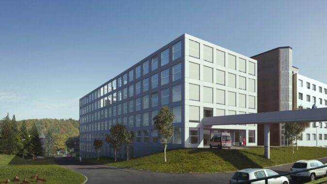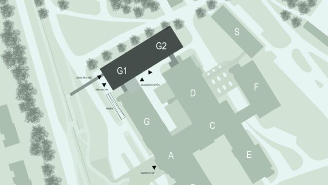 Dodržujeme již zavedený modul 3 x 7,2 m, který nám umožňuje umístit dům mezi komunikaci a zachovat při tom vedle něj průjezd do zásobovacího dvora a ke stávajícímu objektu magnetické rezonance. Menší zastavěná plocha v dolních patrech oproti zadání je naopak doplněna objemem ve vyšších podlažích. Dům má potom kompaktnější tvar a úspornější provoz.