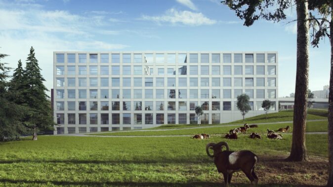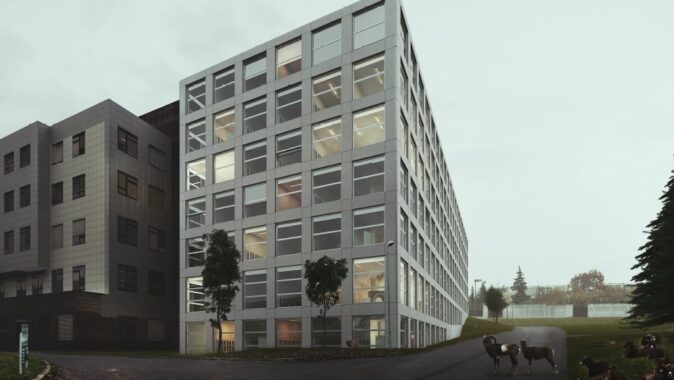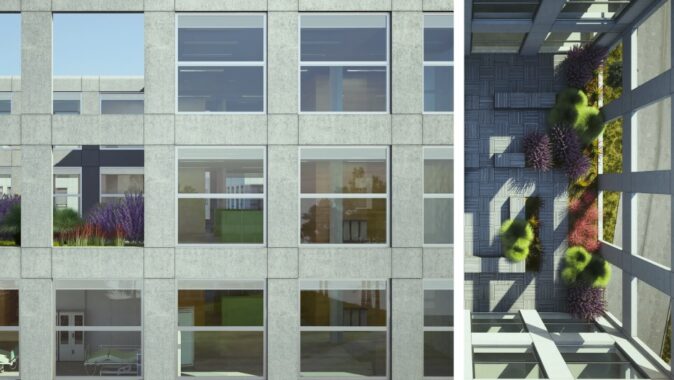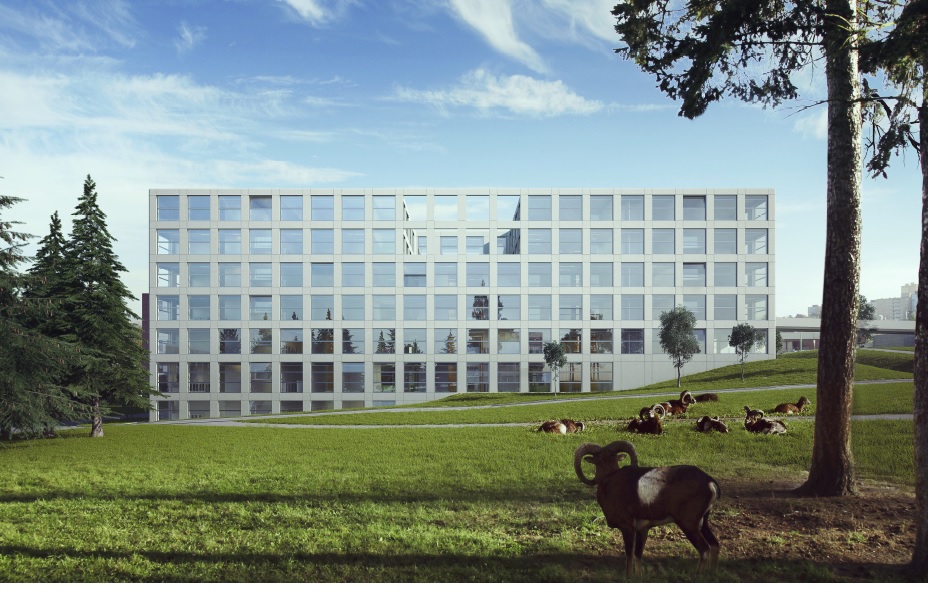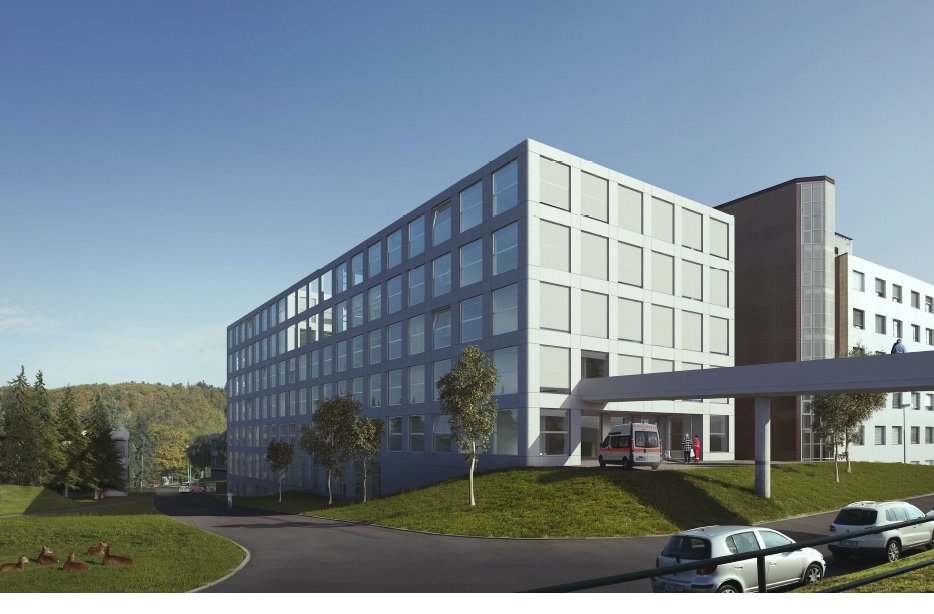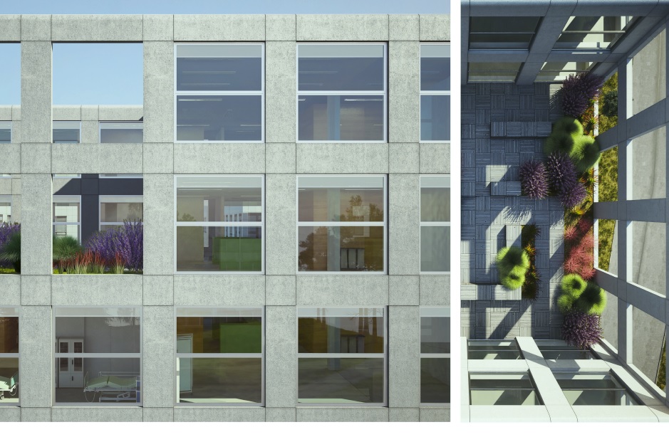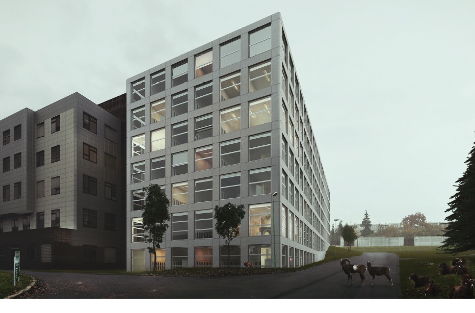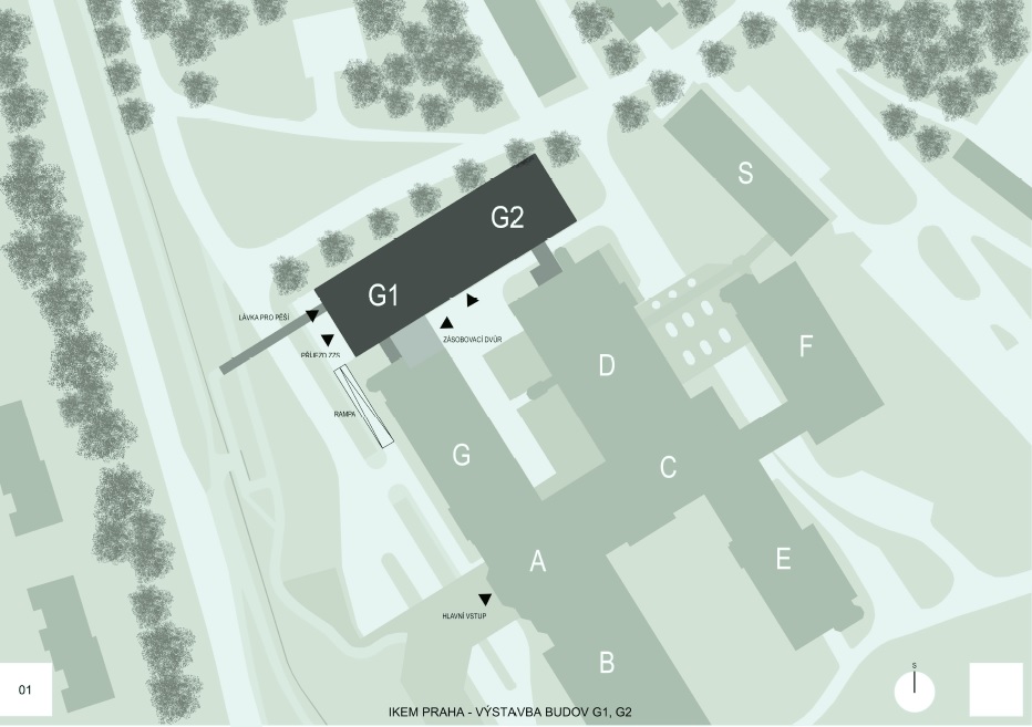 Navrhujeme doplnit komplex IKEM pouze jednou budovou kvádrového a jednoduchého tvaru. Ta by měla ze severovýchodní strany uzavřít a sjednotit areál, který se skládá z několika různě tvarovaných budov. Nový dům by měl výškově i objemově navazovat na objekt k Vídeňské ulici, držet jeho zastavovací čáru a přitom zachovat přírodní charakter areálu s průhledy na Krčský les.