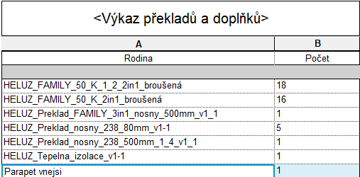 Pro správné generování doplňkových cihel je důležité dodržovat modulovou koordinaci v řádu 250 mm (resp. 125 mm). Důležité je se také zmínit o omezujících podmínkách a pravidlech umístění doplňkových cihel na základě šířky pilíře a dále také výšky parapetu, které jsou převzaty z podkladů pro navrhování. Minimální šířka pilíře pro generování doplňkových cihel je 375 mm, pro parapet je pak omezující podmínka výškový modul 125 mm, nicméně dle zvyklostí z provádění staveb umí doplněk pracovat také s dořezy a v opačném případě také s domaltováním. Tzn. pokud bychom nesplnili uvedené podmínky, doplňkové cihly se nevygenerují. Na obrázku níže můžeme vidět příklad generování doplňkových cihel zděného pilíře o šířce 375 mm a parapetu o výšce 875 mm, který můžeme po doplnění kót využít jako kladecí plán. Díky vytvoření nového výkazu obecných modelů, což je funkcionalita REVITu, můžeme jednoduše vytvořit výkaz všech doplňkových cihel užitých v projektu. V případě nedodržení výškového modulu u nadpraží se doplňkové cihly doříznou na požadovanou výšku.