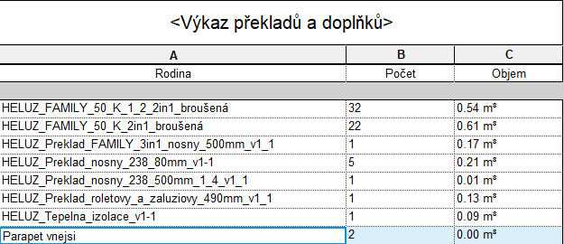 Pracovat můžeme, v případě nosných překladů HELUZ 23,8, se sestavami překladů HELUZ 23,8, které jsou připravené pro všechny možné varianty tloušťky konstrukcí. Při generování překladů Vám dá doplněk na výběr z dostupných sestav překladů pro aktuálně užité zdivo, tzn. pokud budete mít v projektu zdivo tloušťky 500 mm, budete mít na výběr sestavu překladů pro tloušťku 500 mm, a to ve variantě 3+1, případně 4+1. Stejným způsobem pracujeme i s ostatními překlady, kdy je uživateli nabízen překlad, který je vhodný na tloušťku konstrukce uvedenou v projektu. V případě překladu HELUZ FAMILY 3in1 nosný lze uživatelsky zvolit velikost dutiny pro vnější stínící techniku, a to ve vlastnostech překladu pod parametrem „H_I_Typ_prekladu“, kde jsou tři možnosti volby: 1 – Žaluzie, 2 – Roletová schránka 165 x 165 mm, 3 – Roletová schránka 180 x 180 mm.