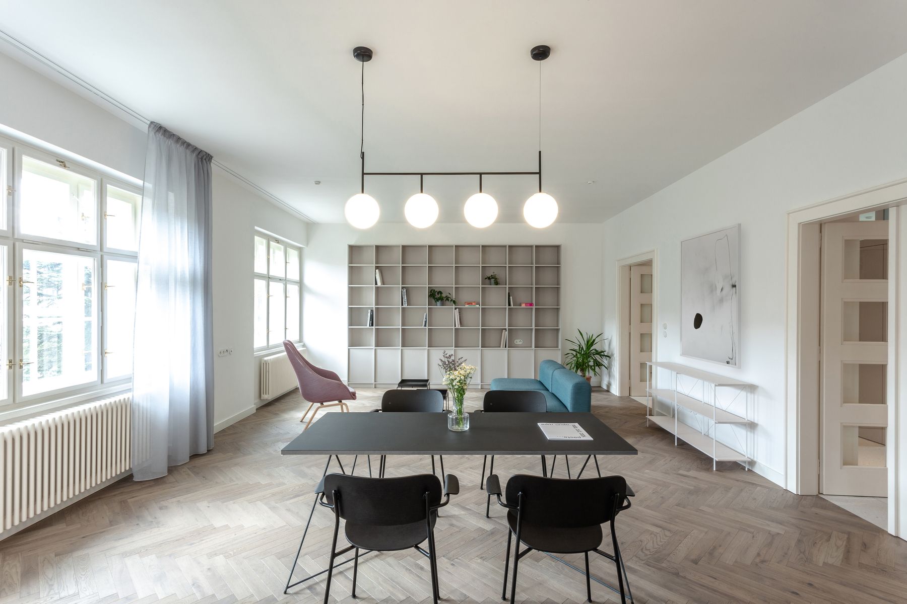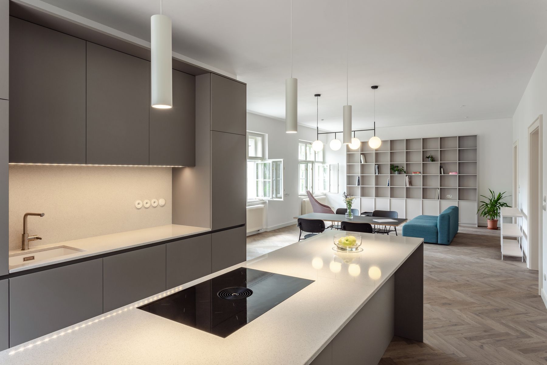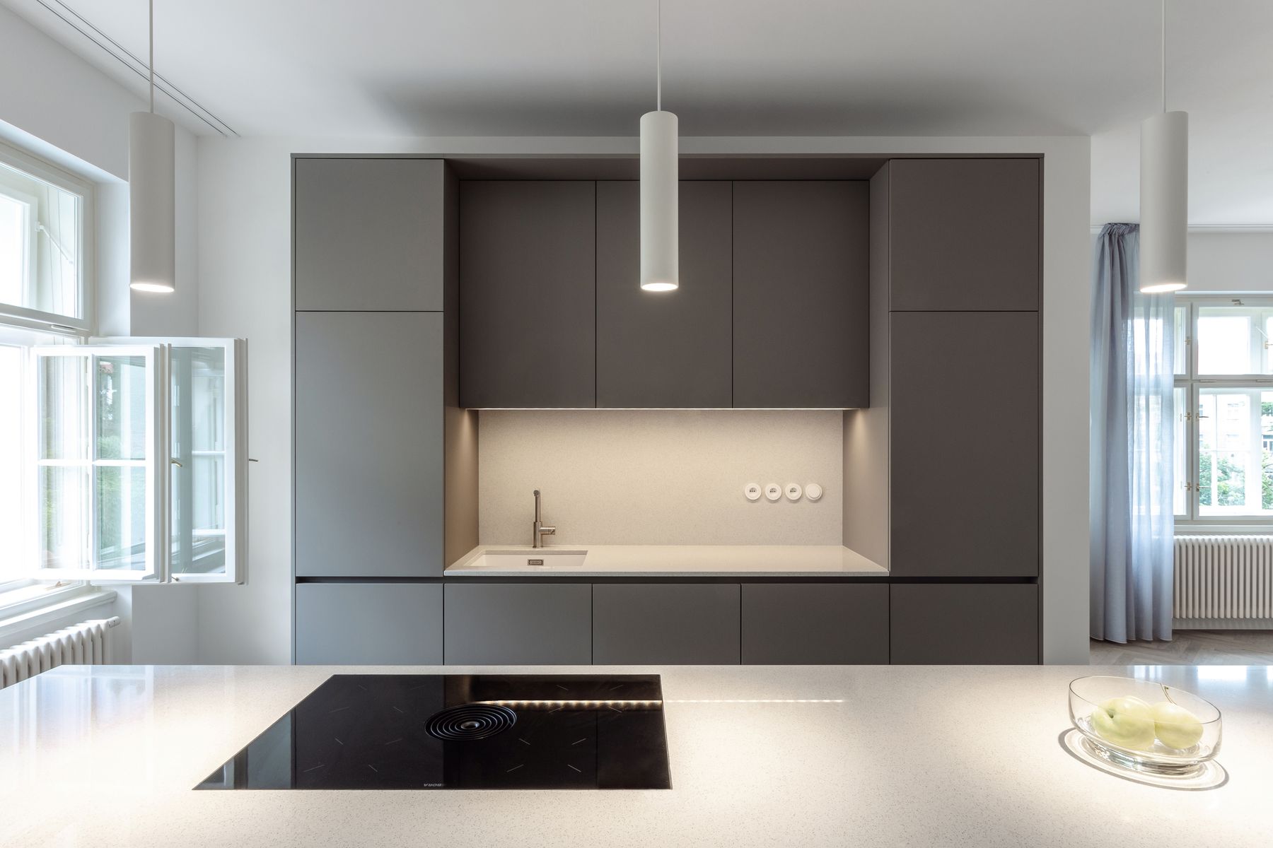 Nájemní bydlení má svá specifika. Absence konkrétního klienta nám nechala volnost v uchopení zadání, ale zároveň s sebou nese příslib univerzálnosti. Pracovali jsme se 135 m² užitné plochy, orientací na tři světové strany a prémiovou lokalitou. Rozhodli jsme se vytvořit byt ve vyšším standardu, který může obývat rodina, pár nebo single osoba.Původní dispoziční řešení se návrhem naředilo do velkorysého obývacího pokoje s kuchyňským koutem a dvěma ložnicemi s komfortním zázemím. Dominantním prvkem interiéru je atypická skříňová sestava, která kombinuje hlavní úložný prostor se dveřmi do koupelen, wc a prádelny a zdroj přirozeného světla do chodby. Toto řešení umožnilo umístit kompletní zázemí bytu do 35 m² a ponechat tak většinu plochy obytnému prostoru.Celý byt je barevně komponován ve světlých odstínech béžové a šedé jako soudobé doplnění původních historizujících prvků v barvě slonové kosti. Masivní vlysová dubová podlaha odkazuje svou skladbou a odstínem na původní podlahovou krytinu a přirozeně navazuje na lité terrazzo v prostorách zázemí bytu.