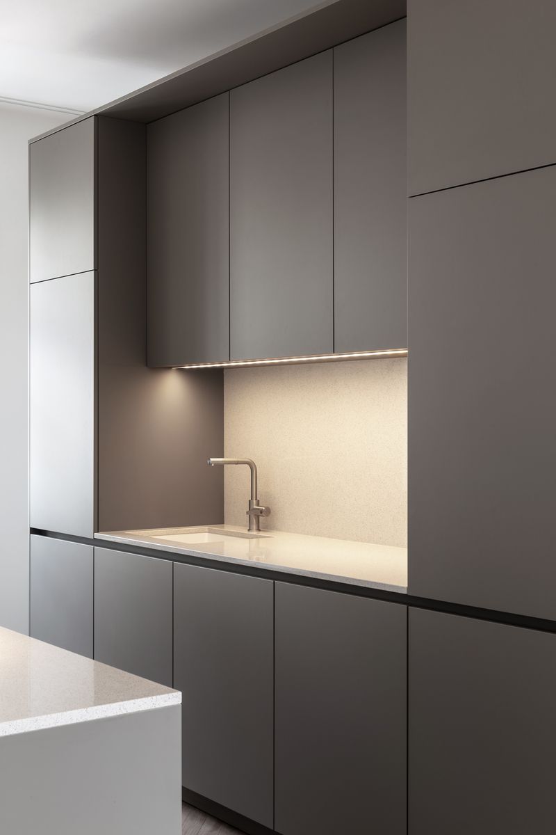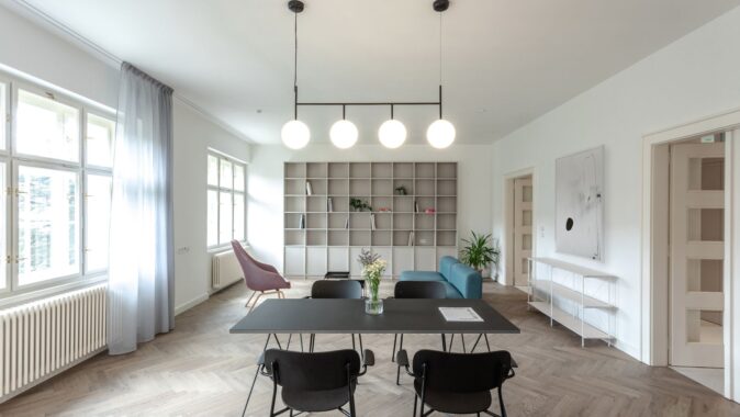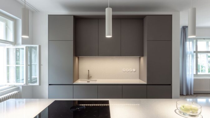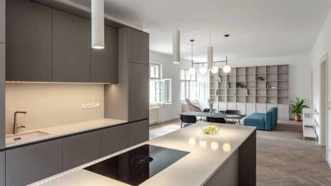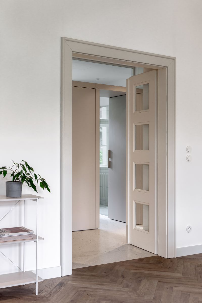 Nájemní bydlení má svá specifika. Absence konkrétního klienta nám nechala volnost v uchopení zadání, ale zároveň s sebou nese příslib univerzálnosti. Pracovali jsme se 135 m² užitné plochy, orientací na tři světové strany a prémiovou lokalitou. Rozhodli jsme se vytvořit byt ve vyšším standardu, který může obývat rodina, pár nebo single osoba.Původní dispoziční řešení se návrhem naředilo do velkorysého obývacího pokoje s kuchyňským koutem a dvěma ložnicemi s komfortním zázemím. Dominantním prvkem interiéru je atypická skříňová sestava, která kombinuje hlavní úložný prostor se dveřmi do koupelen, wc a prádelny a zdroj přirozeného světla do chodby. Toto řešení umožnilo umístit kompletní zázemí bytu do 35 m² a ponechat tak většinu plochy obytnému prostoru.Celý byt je barevně komponován ve světlých odstínech béžové a šedé jako soudobé doplnění původních historizujících prvků v barvě slonové kosti. Masivní vlysová dubová podlaha odkazuje svou skladbou a odstínem na původní podlahovou krytinu a přirozeně navazuje na lité terrazzo v prostorách zázemí bytu.