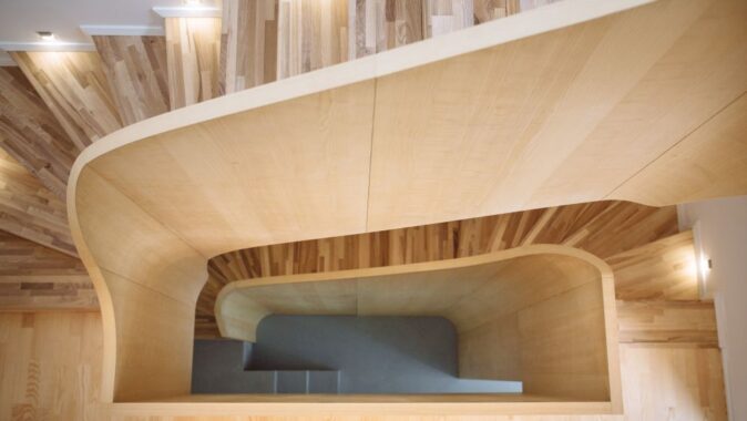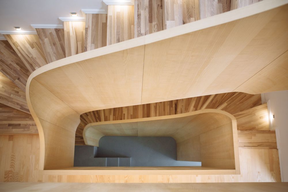 První podlaží zahrnuje vstupní část se šatnou, halu s prádelnou a toaletou a společenskou místnost s výrazně tónovaným nábytkem a přístupem do zahrady. Druhé nadzemní podlaží tvoří převážně obývací pokoj propojený s kuchyní a jídelnou. Následuje chodba se vstupy do spíže, toalety a pracovny. Ve třetím nadzemním podlaží jsou dva dětské pokoje, ložnice a dvě koupelny. Podlaží propojuje výrazově dominantní dřevěné schodiště, které svojí dynamickou křivkou vytváří sochu vinoucí se celým domem (materiál na stupních je z jádrového jasanu, zábradlí ze světlého jasanu).