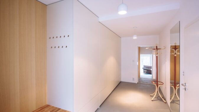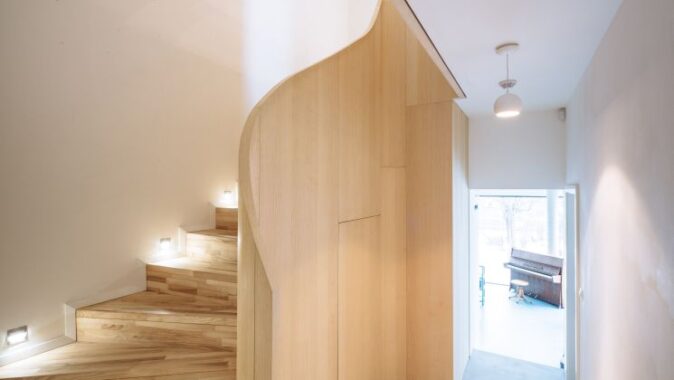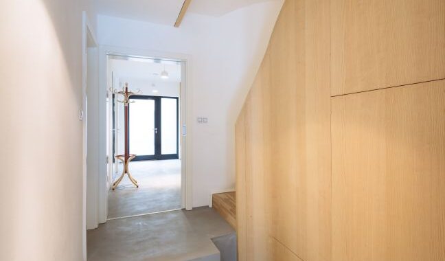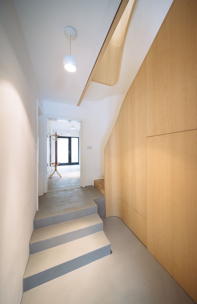 Zadáním investora bylo navrhnout interiér do třípodlažního rodinného domu. Hlavním motivem, který se opakuje ve všech nadzemních podlažích, je použití dřeva (dubová spárovka, jasan) na nábytku a opakující se niky různých barevných odstínů nebo druhy dřevin. Obytné místnosti mají dřevěnou podlahu, chodby a koupelny byly opatřeny taženou epoxidovou stěrkou. Celý prostor domu materiálově spojuje nábytek ze světlého jasanu v kontrastu s plochami dřeva tmavšího (jádrový jasan).