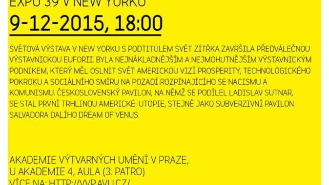 Světová výstava v New Yorku s podtitulem Svět zítřka završila předválečnou výstavnickou euforii. Byla nejnákladnějším a nejmohutnějším výstavnickým podnikem, který měl oslnit svět americkou vizí prosperity, technologického pokroku a sociálního smíru na pozadí rozpínajícího se nacismu a komunismu. Československý pavilon, na němž se podílel Ladislav Sutnar, se stal první trhlinou americké utopie, stejně jako subverzivní pavilon Salvadora Dalího Dream of Venus. Iva Knobloch, odbornice na Ladislava Sutnara z UPM v Praze, do své přednášky zahrne také nová zjištění z amerických archivů, uskutečněná díky Fulbrightově stipendiu.
