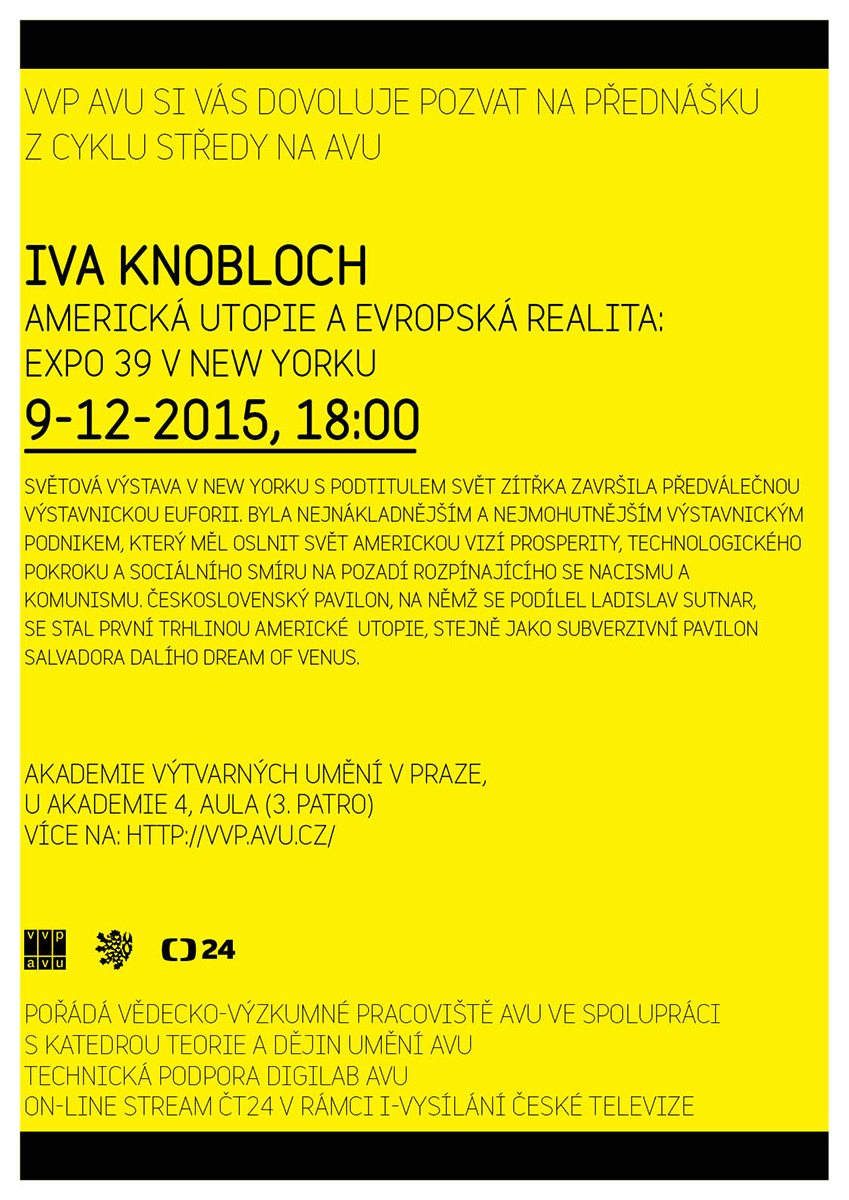 Světová výstava v New Yorku s podtitulem Svět zítřka završila předválečnou výstavnickou euforii. Byla nejnákladnějším a nejmohutnějším výstavnickým podnikem, který měl oslnit svět americkou vizí prosperity, technologického pokroku a sociálního smíru na pozadí rozpínajícího se nacismu a komunismu. Československý pavilon, na němž se podílel Ladislav Sutnar, se stal první trhlinou americké utopie, stejně jako subverzivní pavilon Salvadora Dalího Dream of Venus. Iva Knobloch, odbornice na Ladislava Sutnara z UPM v Praze, do své přednášky zahrne také nová zjištění z amerických archivů, uskutečněná díky Fulbrightově stipendiu.