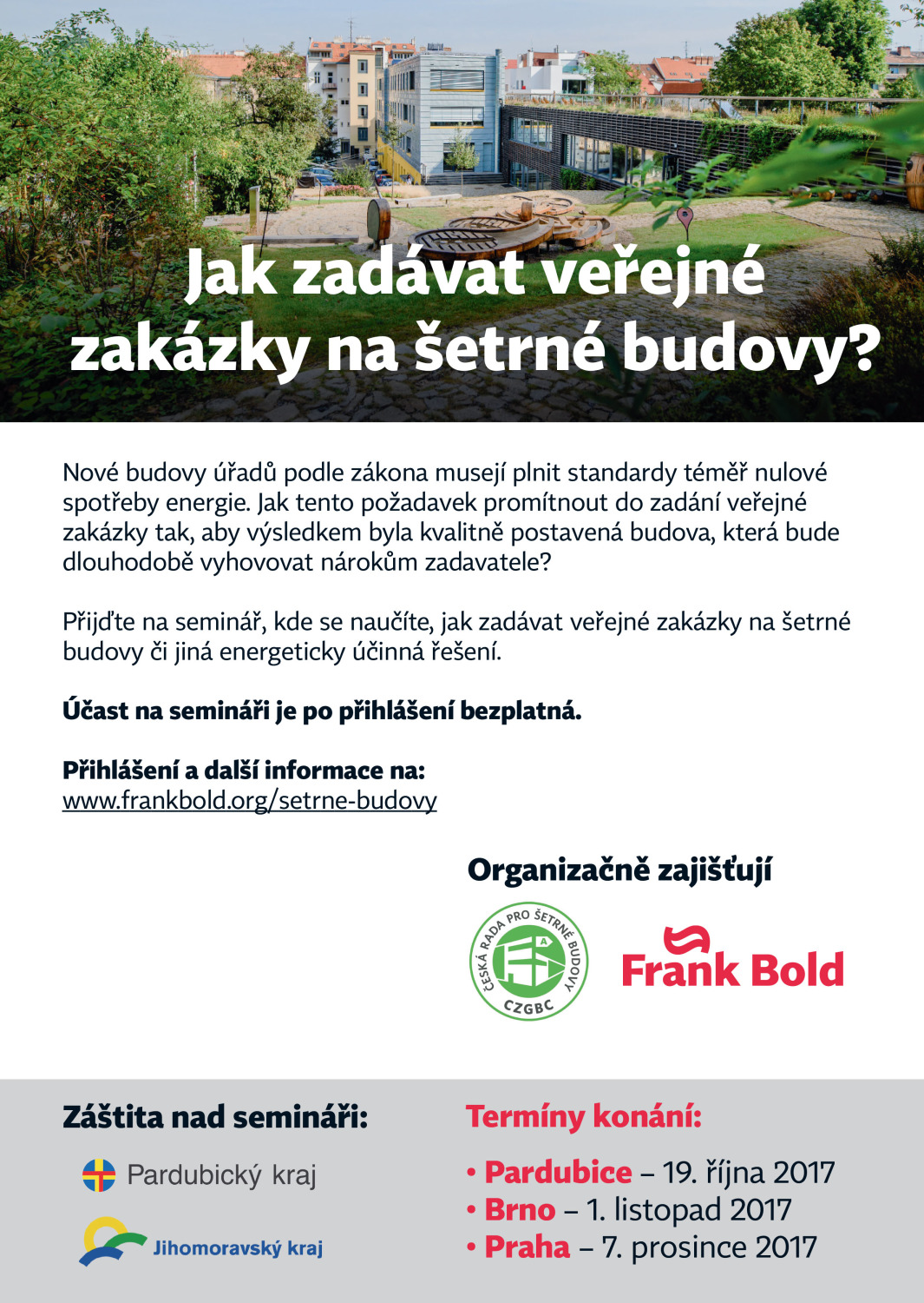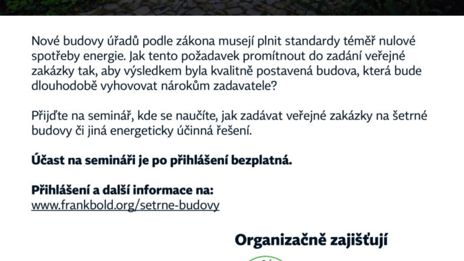 Přijďte na seminář, který pořádá Frank Bold společně s Českou radou pro šetrné budovy a kde se naučíte, jak zadávat veřejné zakázky na šetrné budovy či jiná energeticky účinná řešení. Účast na semináři je bezplatná.