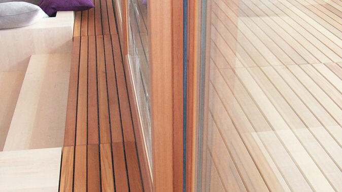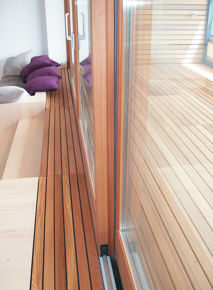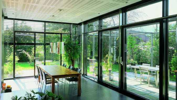 posuvných terasových dveří, které jsou součástí větších zasklených ploch.