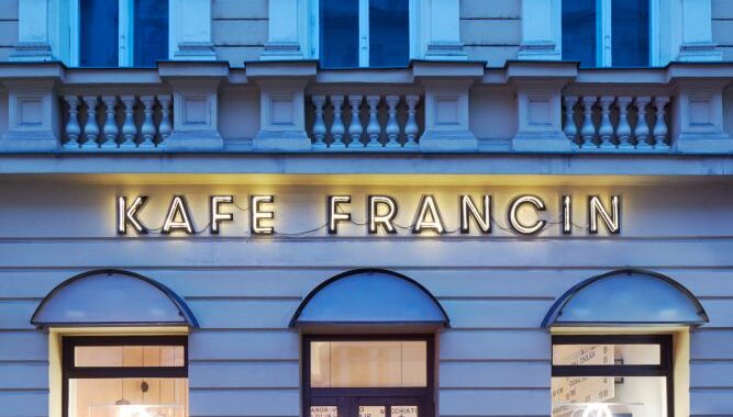 Díky Kafe Francin, kavárně sídlící přímo naproti zastávce, mají lidé čekající na tramvaj č. 17 na Strossmayerově náměstí důvod svůj odjezd trochu odložit. Dva neonové nápisy na každém z velkorysých oken nikoho nenechají na pochybách, co se uvnitř děje. Pečeme a pražíme, svítí do daleka ve dne v noci. Právě spojení těchto dvou činností je stěžejní charakteristikou neobvyklého podniku.