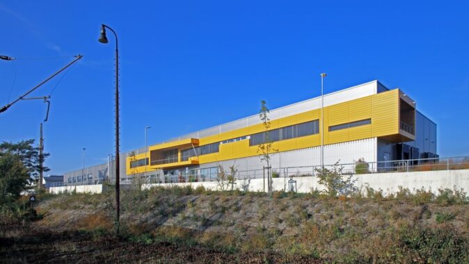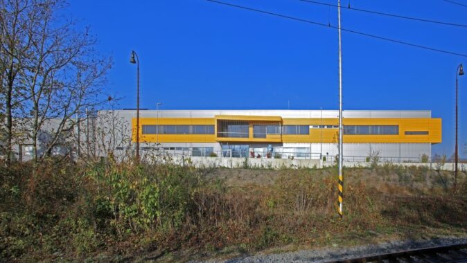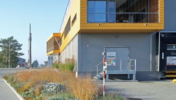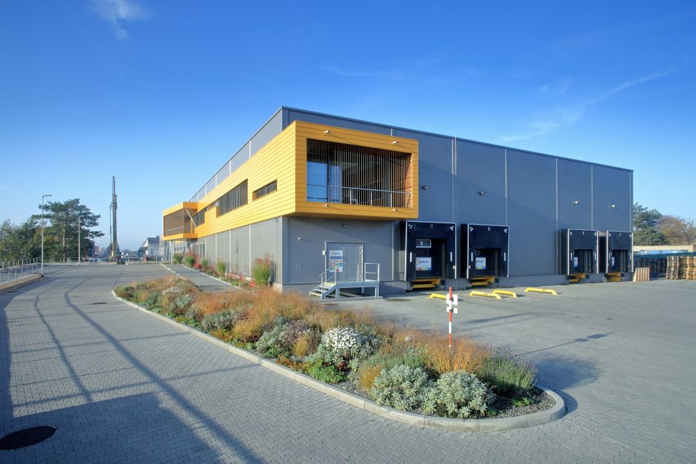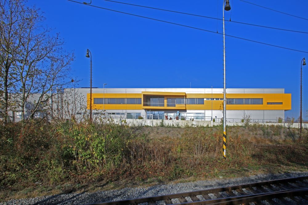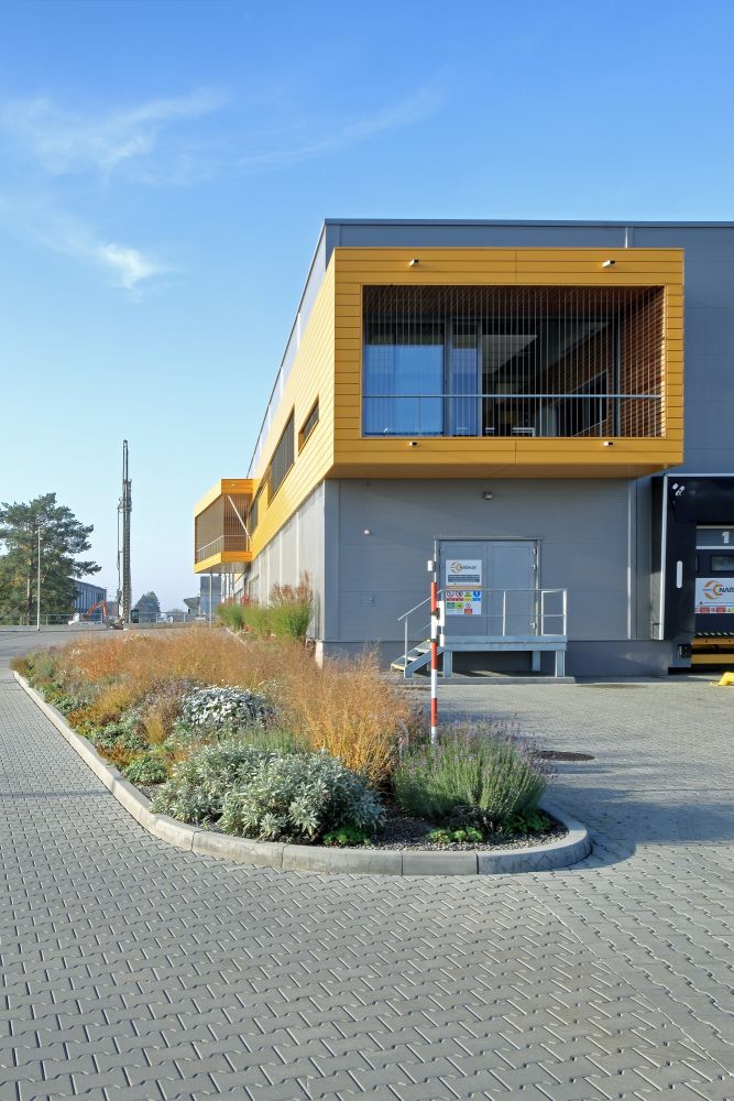 Důležitou součástí zadání bylo podpořit základní filozofii společnosti – sounáležitost zaměstnanců jednotlivých oddělení administrativy i celé firmy. Proto jsou kanceláře v maximální možné míře propojené jak mezi sebou, tak i se skladovací a distribuční částí. Objem kanceláří je jednoznačně propsán do základní šedé hmoty haly žlutým hranolem – tento odstín žluté je firemní barvou. Vstup a zasedací místnost akcentují balkony, dřevěný obklad prochází plynule z interiéru do exteriéru. Obdobně přechází popínavá zeleň fasády do vstupní převýšené haly.